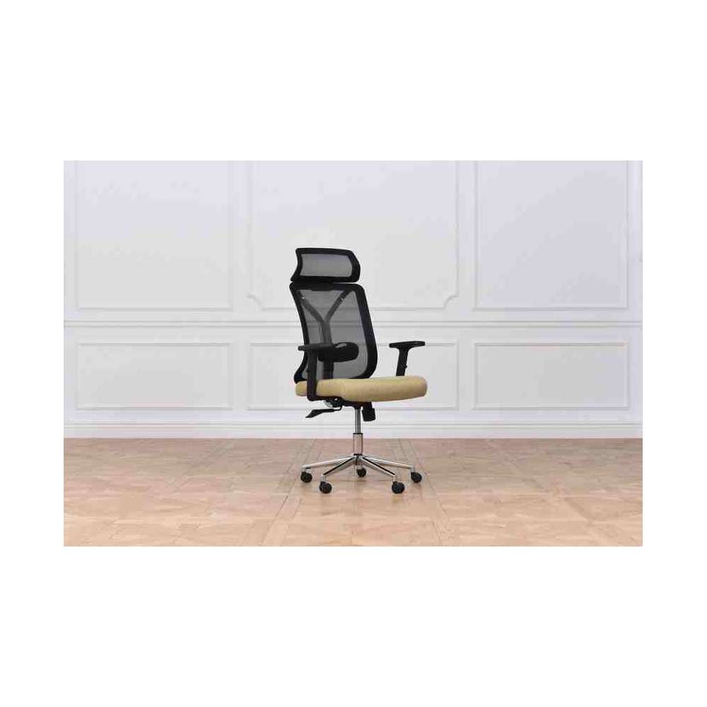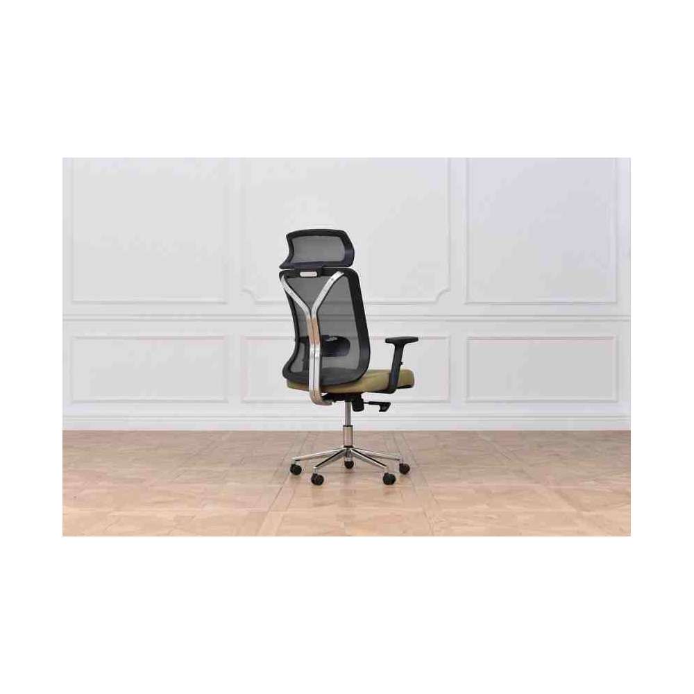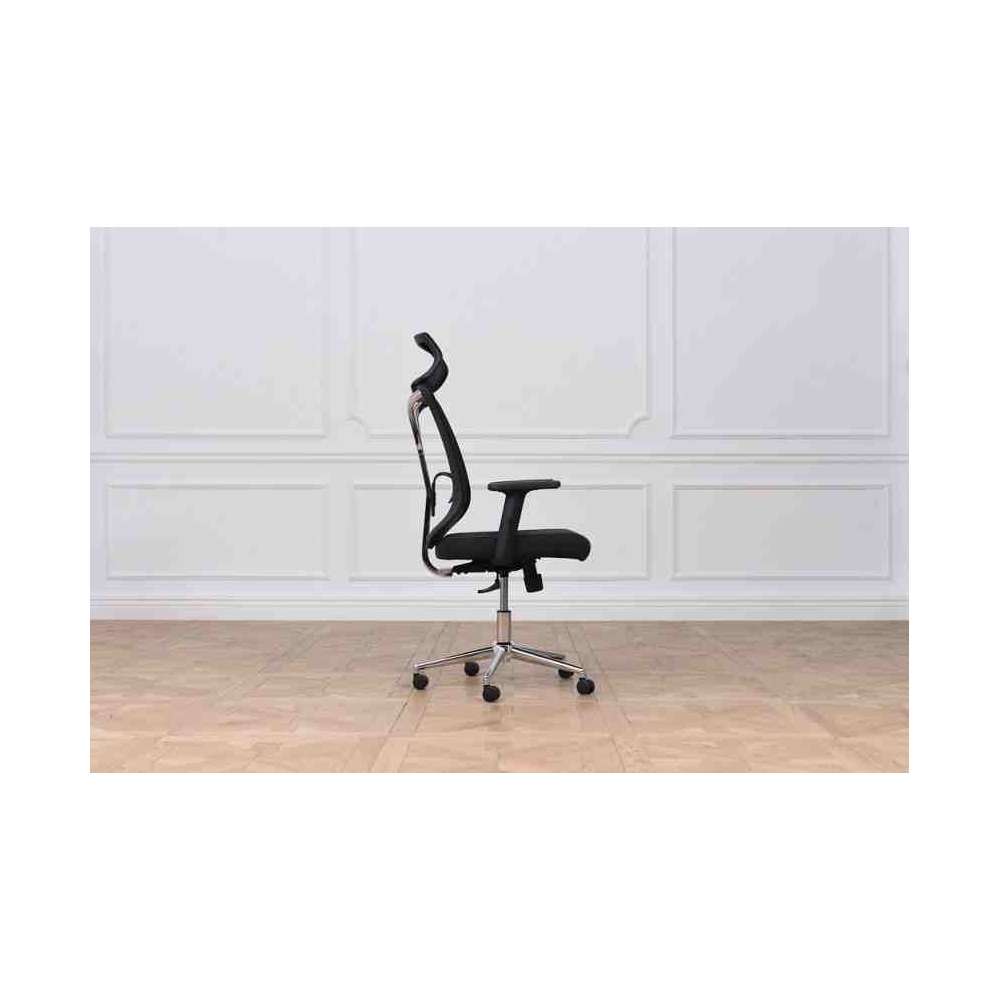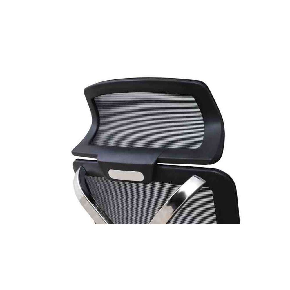 Flow to ergonomiczne, wyściełane krzesło biurowe, wykonane z wysokiej jakości tkaniny odpornej na plamy i wodę, z oddychającą siateczką w kolorze grafitowym, czarnym, niebieskim i zielonym. Konstrukcja oparcia i pięcioramienna podstawa z chromowanego metalu. Krzesło wyposażone w podłokietniki PCV z regulacją pochylenia i wysokości, zagłówek i oparcie z regulacją pochylenia, siedzisko z regulacją wysokości. Zamykana funkcja swing.