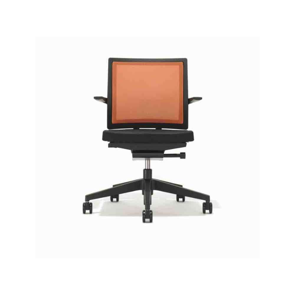 Strukturalne połączenie mechanizmu z oparciem nadaje krzesłu obrotowemu wyrazistą sylwetkę, podobnie jak wygodnie tapicerowane siedzisko o geometrycznym kształcie.