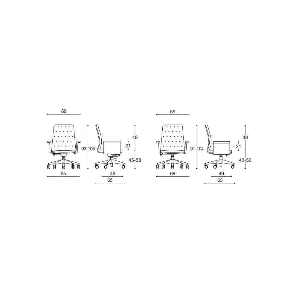 umożliwiającym blokowanie pleców w różnych pozycjach, regulacją ciężaru, systemem antywstrząsowym, a także podnośnikiem gazowym. Podstawa z polerowanego aluminium z 5 ostrogami na samohamownych gumowych kółkach. Ramiona tapicerowane stałe. Dostępny również jako krzesło gościnne na chromowanej ramie wspornikowej ze stałymi podłokietnikami.