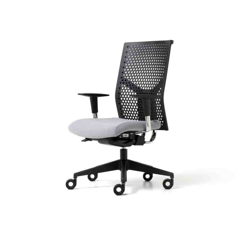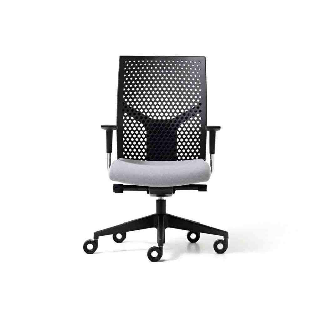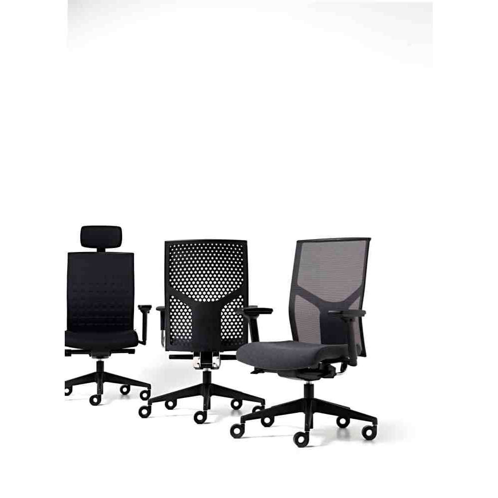Fit to fotel obrotowy z możliwością wyboru oparcia: czarna lub biała siatka; polipropylen czarny lub biały; całkowicie tapicerowane tkaniną termoformowaną. Regulacja wysokości z chromowanym ruchem zintegrowanym podparciem lędźwiowym. W pełni tapicerowane siedzisko elastyczną pianką poliuretanową. Jego mechanizm synchronizacji zapewnia regulację gazową i pochylenie oparcia, blokowane w pięciu pozycjach, z mechanizmem przeciwwstrząsowym i regulacją masy ciała. Podstawa z czarnego lub białego nylonu lub polerowanego aluminium. Trzy rodzaje podłokietników: stały; regulowana wysokość (1d); regulacja wysokości i głębokości z obrotem (3d). Wyposażenie opcjonalne: zagłówek, system przesuwny do regulacji głębokości siedziska, kółka z otworami.