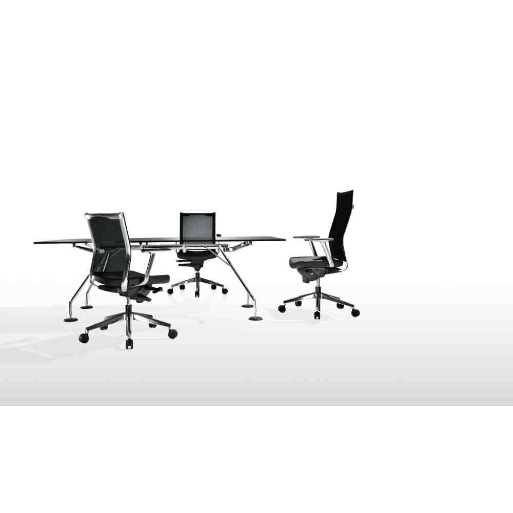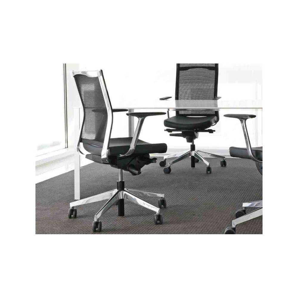 Seria foteli o eleganckim designie z oparciem z siatki wspartej na polerowanych profilach aluminiowych.