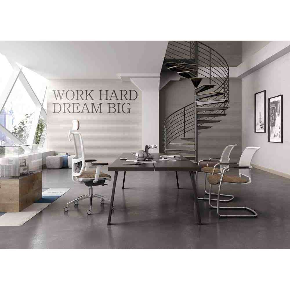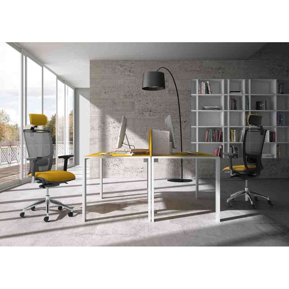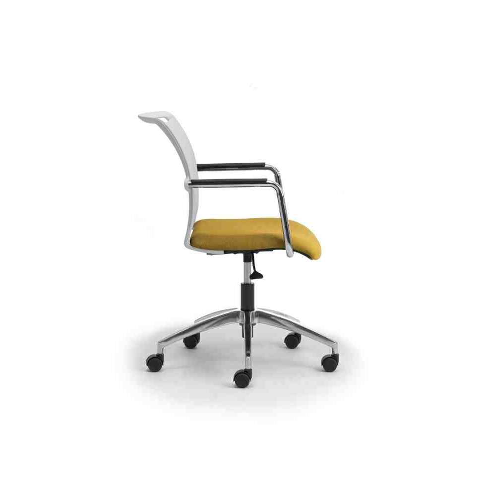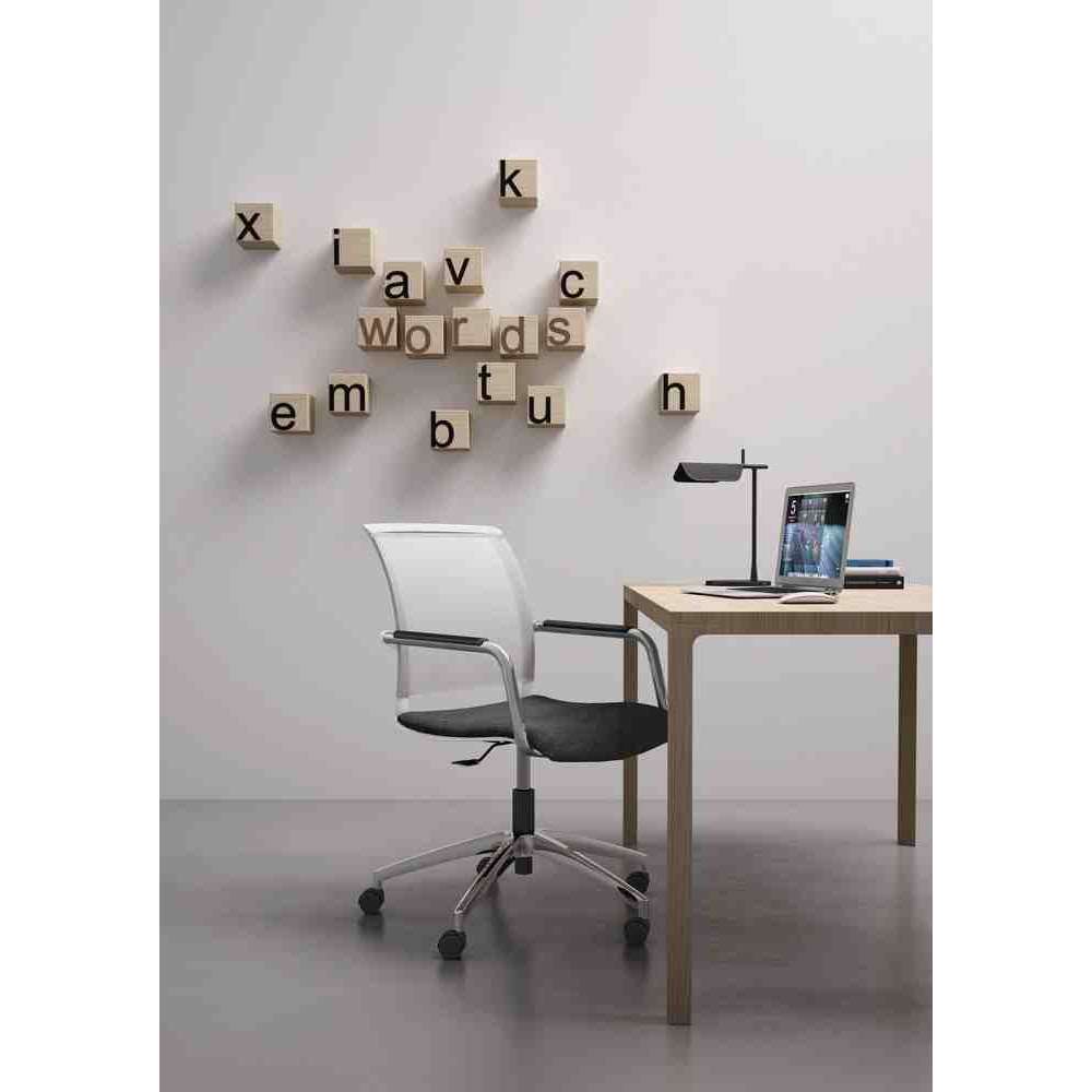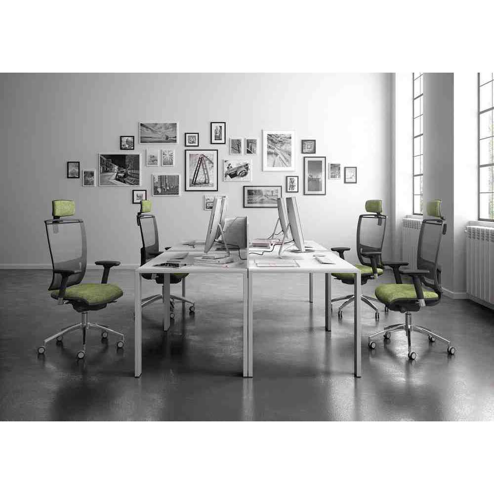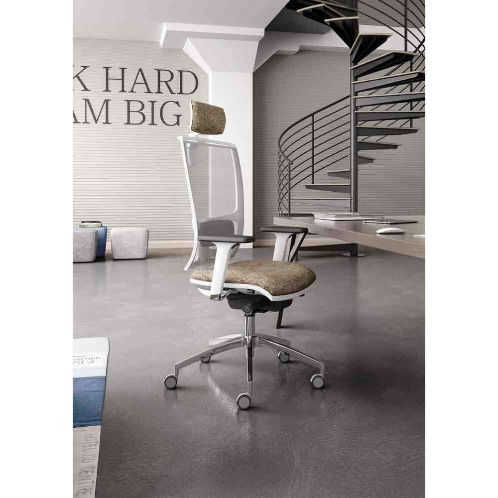 Zsynchronizowany mechanizm przechylania + przesuwane siedzenie. Oparcie z siatki o regulowanej wysokości ze zintegrowaną regulacją podparcia lędźwiowego. Kolory oczek: czarny, szary i biały. Podstawa z polerowanego aluminium lub czarnego nylonu. Samohamowne kółka z nylonu. 3-D (wysokość, szerokość, obrót) lub 4-D (+ regulacja szerokości) lub stałe ramiona z pętlą z miękkimi nakładkami lub stałe ramiona PP. Opcjonalnie regulowany zagłówek. Rama wspornikowa dla gości z podłokietnikami.