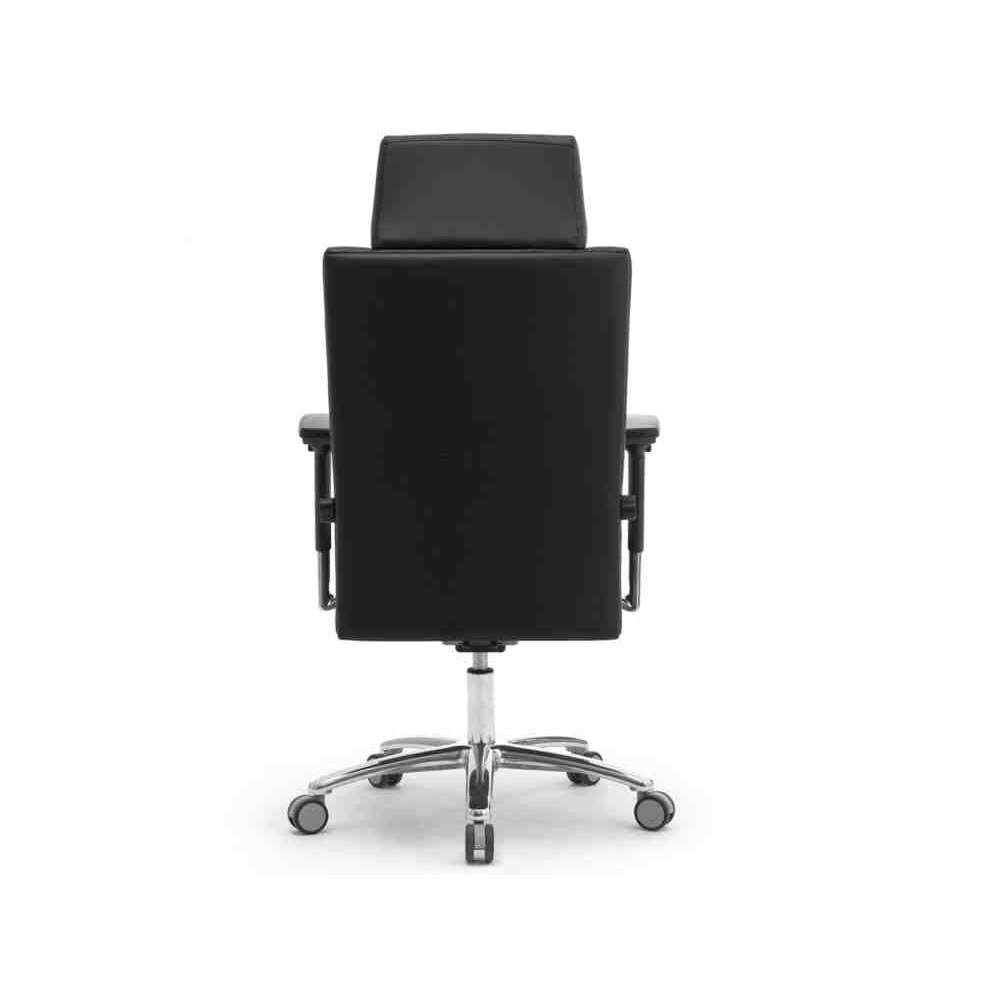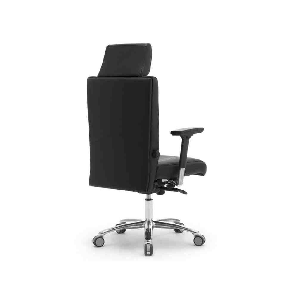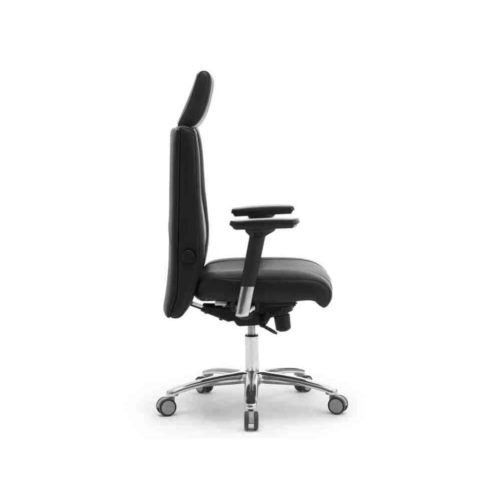 Zsynchronizowany mechanizm przechyłu + wysuwane siedzisko, urządzenie przeciwwstrząsowe i indywidualna kontrola naciągu. Gruba wyściółka z ekspandowanej pianki uretanowej. 4-stopniowa regulacja podparcia lędźwiowego „Schukra” (wejście-wyjście/góra-dół). Podstawa z polerowanego aluminium 5-ramienna z nylonowymi kółkami Ø 65 mm, podłokietniki z regulacją 4-D (wysokość, głębokość, szerokość i obrót).