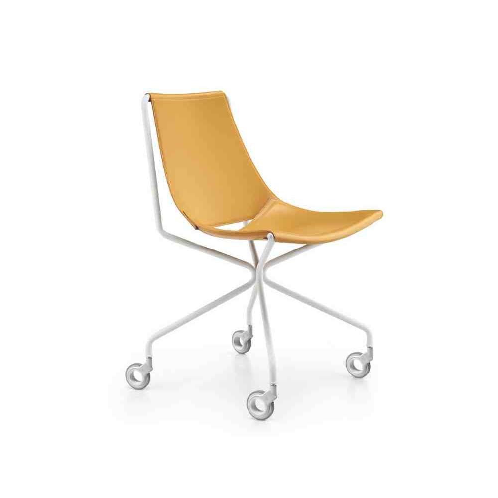 Krzesło z czterostronną podstawą z lakierowanej stali dostępne z podłokietnikami lub bez. Jest dostępny z białymi kołami w połączeniu z białą podstawą lub chromowanymi kołami z czarną krawędzią w połączeniu z czarną podstawą. Siedzisko i oparcie w skórze.
