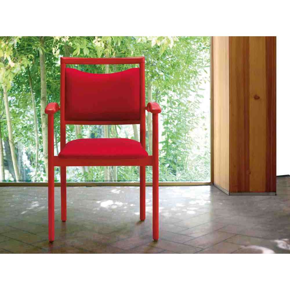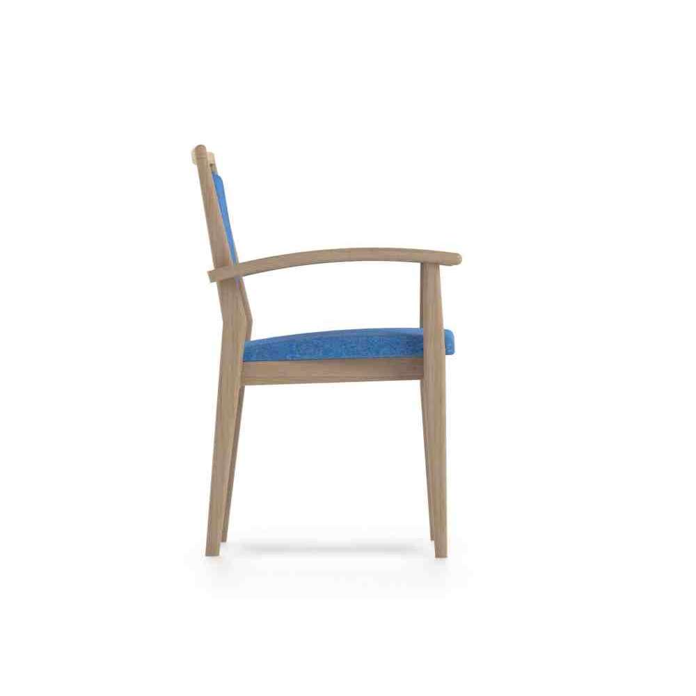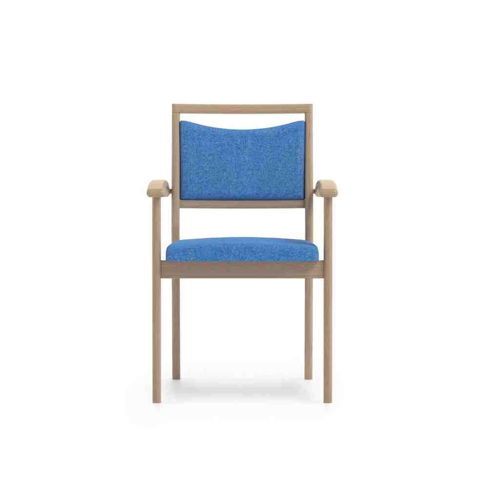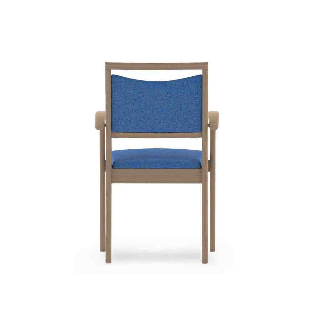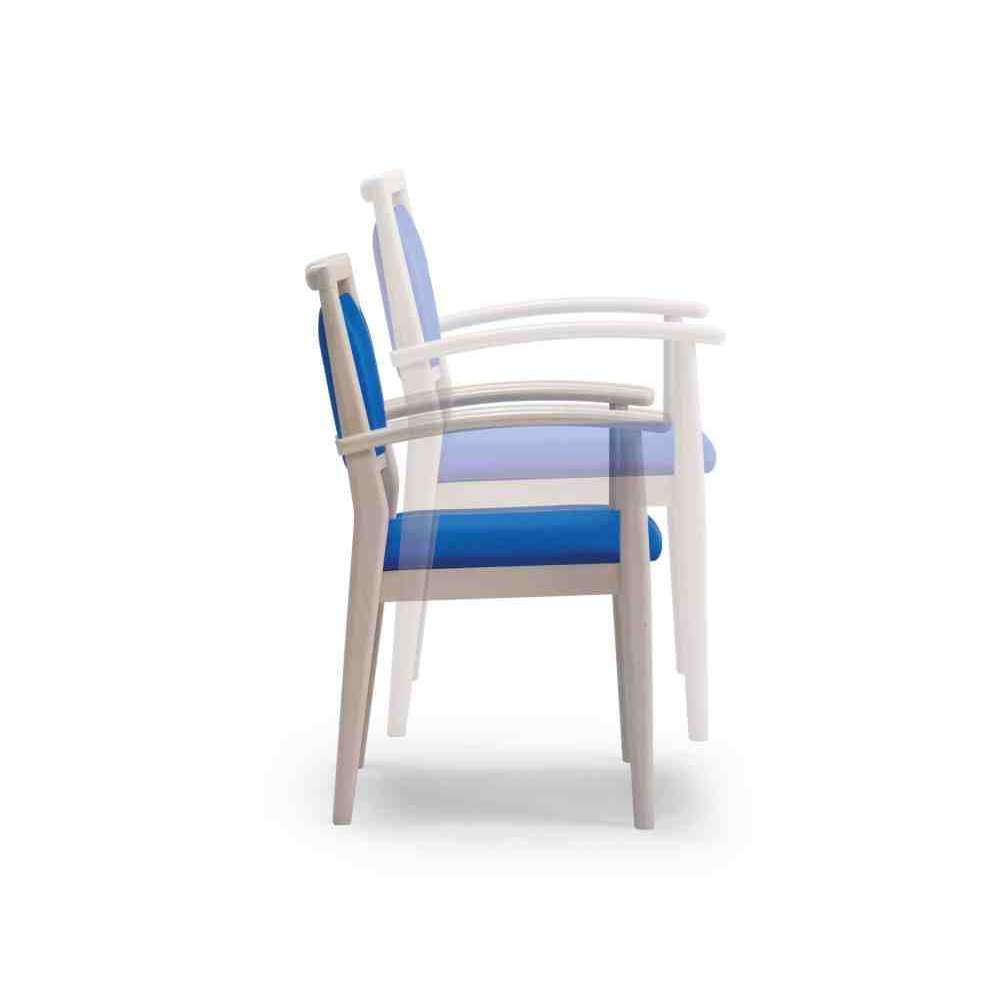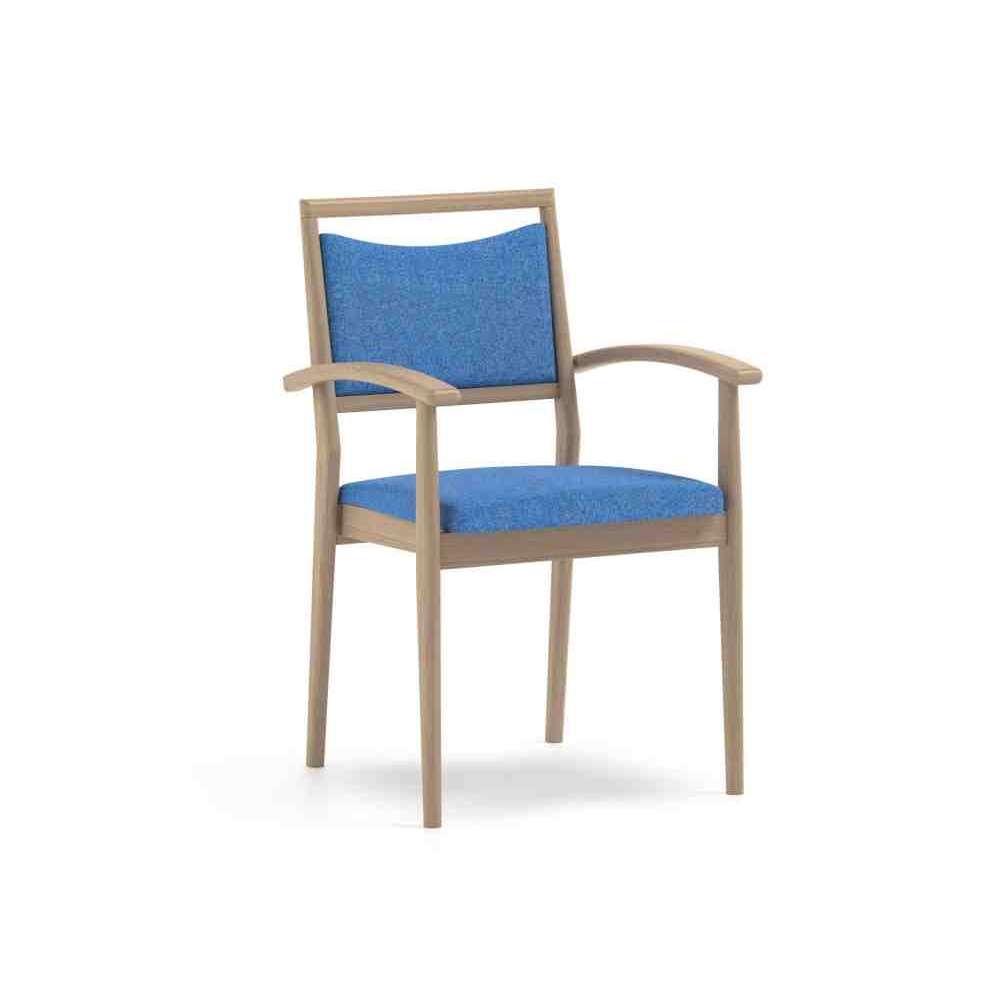 Krzesło z podłokietnikami. Wyściełane siedzisko i oparcie, uchwyt do obsługi na oparciu. Możliwość układania w stos. Stała pozycja. Buk.