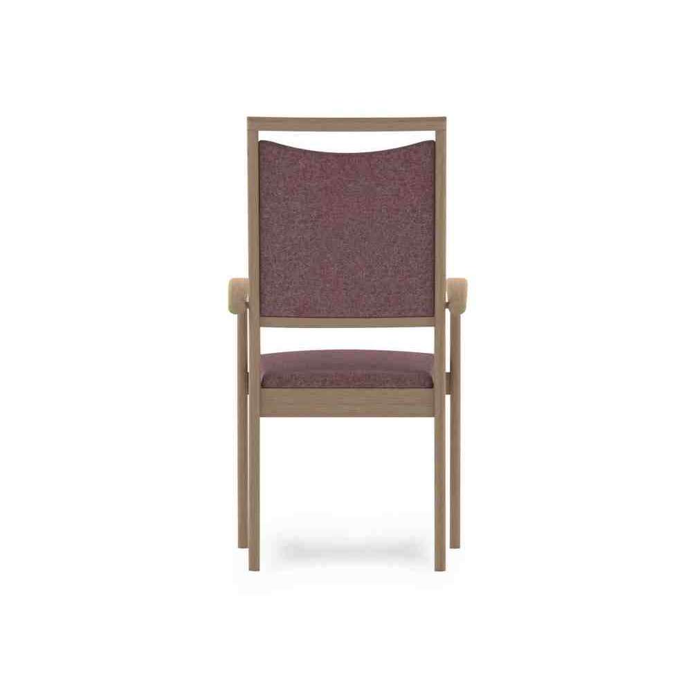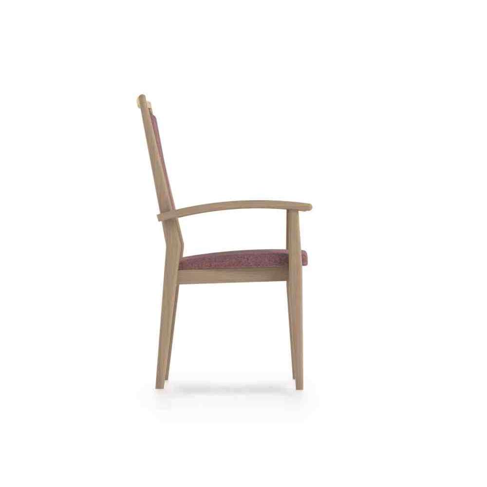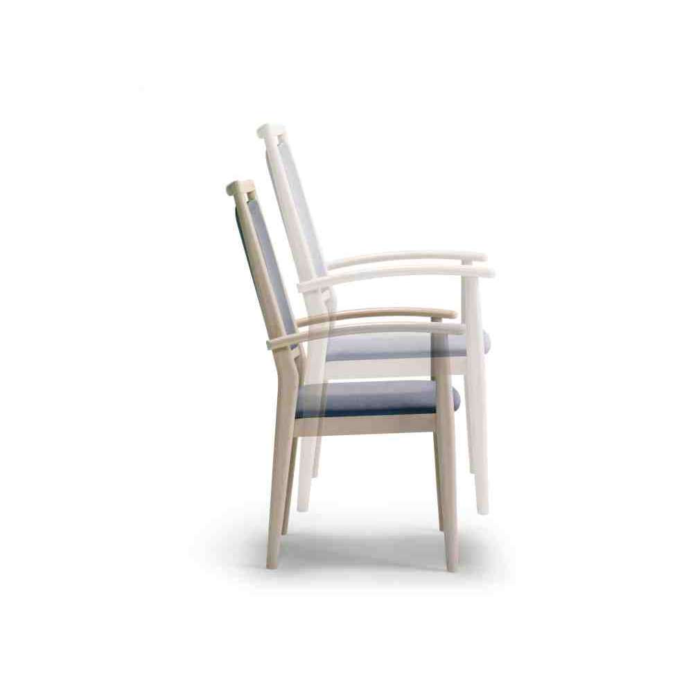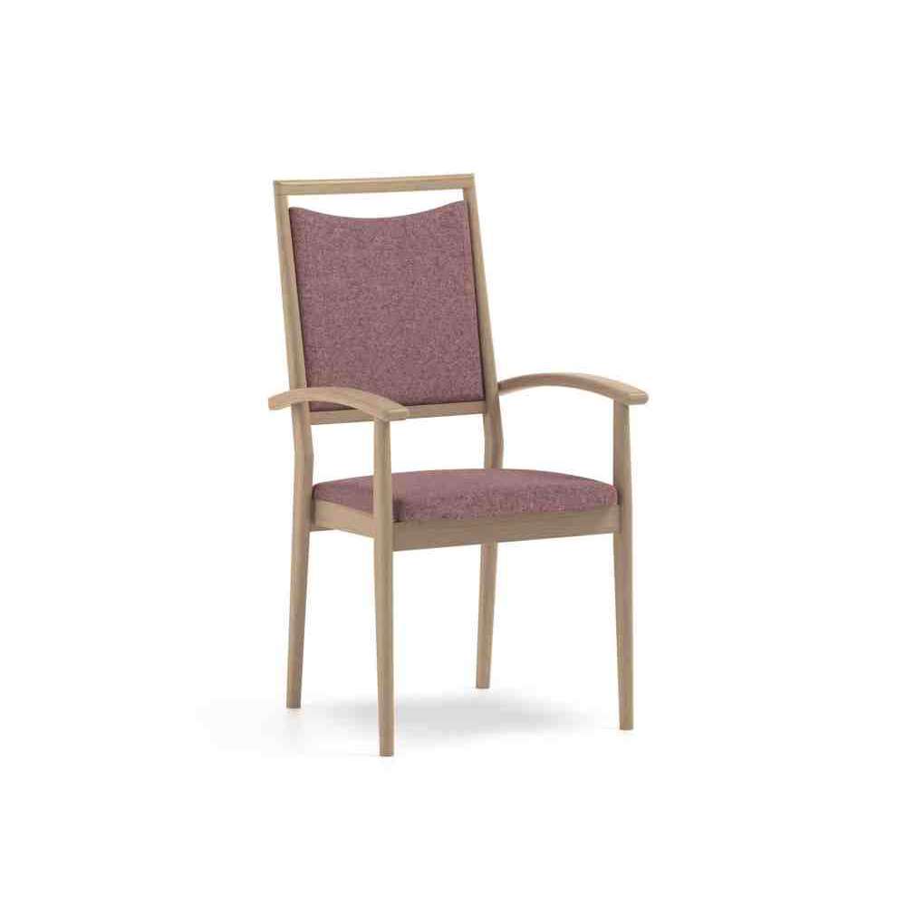 Krzesło z podłokietnikami. Wyściełane siedzisko i oparcie, uchwyt do obsługi na oparciu. Możliwość układania w stos. Stała pozycja. Buk.