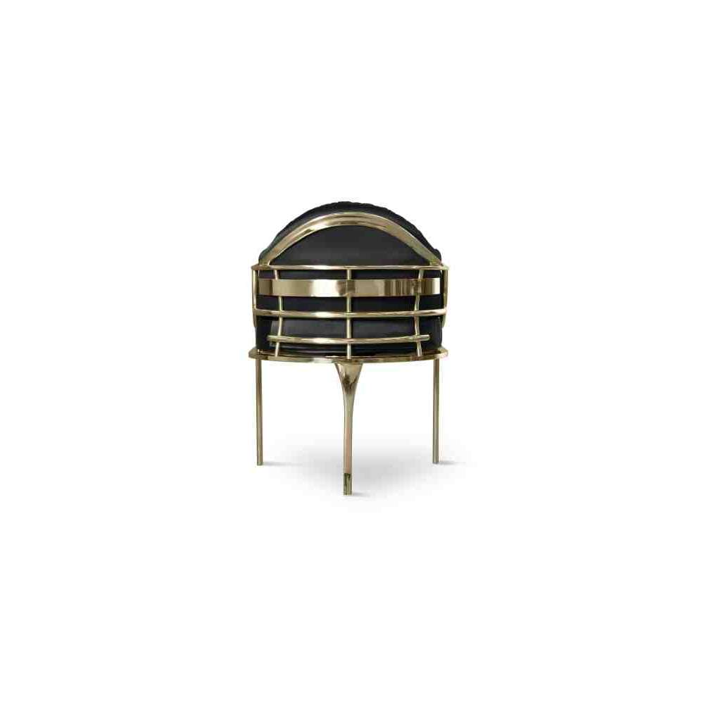 Nowoczesna wersja z azjatyckim klimatem. Klasyczne krzesło KOKET z litego mosiądzu z trzema nogami wspiera klasyczne plecy inspirowane Azją z luźną poduszką.