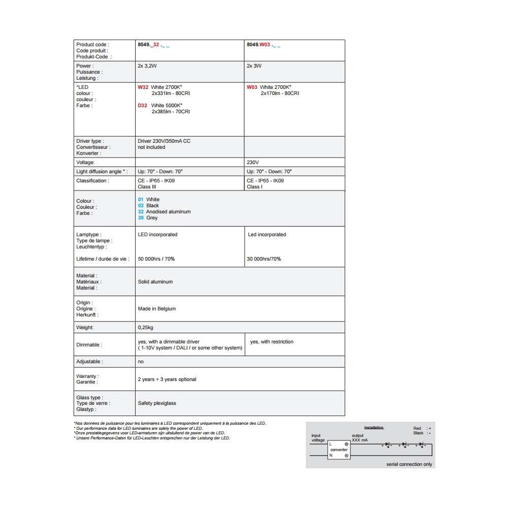Stopień ochrony IP65 - IK09( ccc333)Klasa 1 (230V) lub Klasa 3 (350mA)