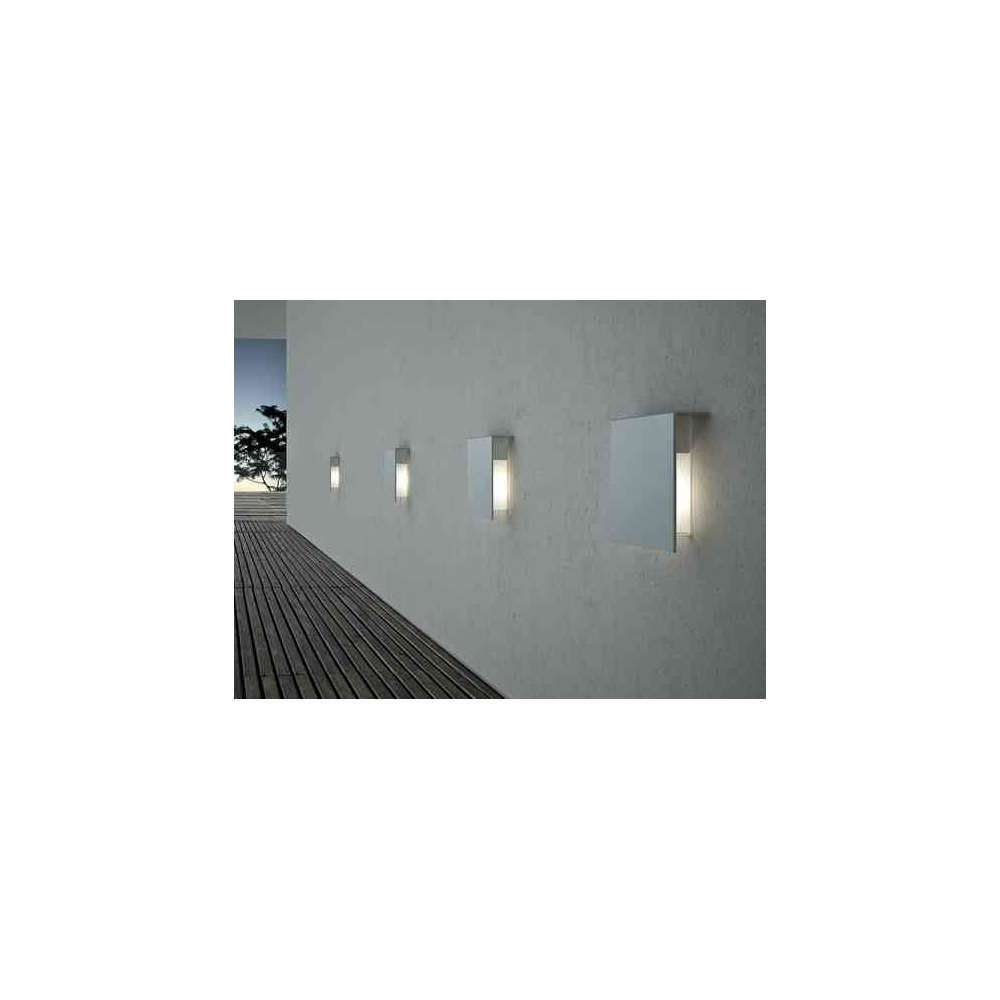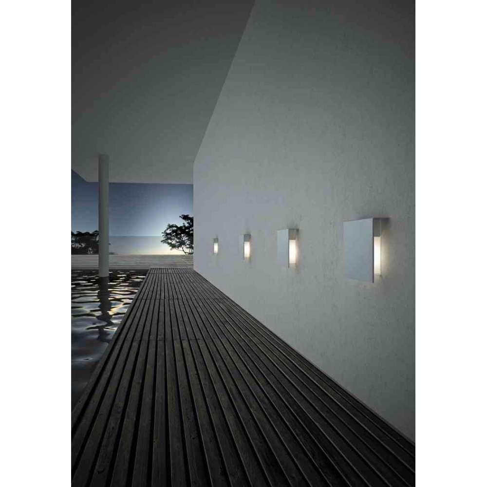 Kinkiet zewnętrzny z konstrukcją ze stali nierdzewnej i kloszem z opalizującego białego poliwęglanu. Ekran ochronny z przezroczystego szkła borokrzemianowego.