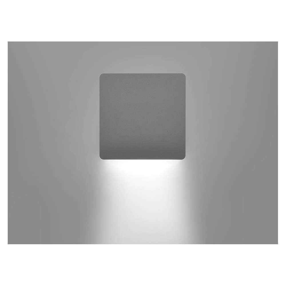 Kwadratowa ścienna oprawa natynkowa tworząca na ścianie jednokierunkowy efekt oświetlenia typu wall-washer. Oprawa do montażu na zewnątrz na ścianie. Korpus z odlewanego ciśnieniowo aluminium bez miedzi, fosforanowany i malowany proszkowo poliestrem, klosz z matowego poliwęglanu, formowana uszczelka silikonowa i śruby ze stali nierdzewnej. Wbudowany sterownik LED 220-240V 50-60Hz, z 6 diodami CREE XH-G średniej mocy. Stopień ochrony IP65.