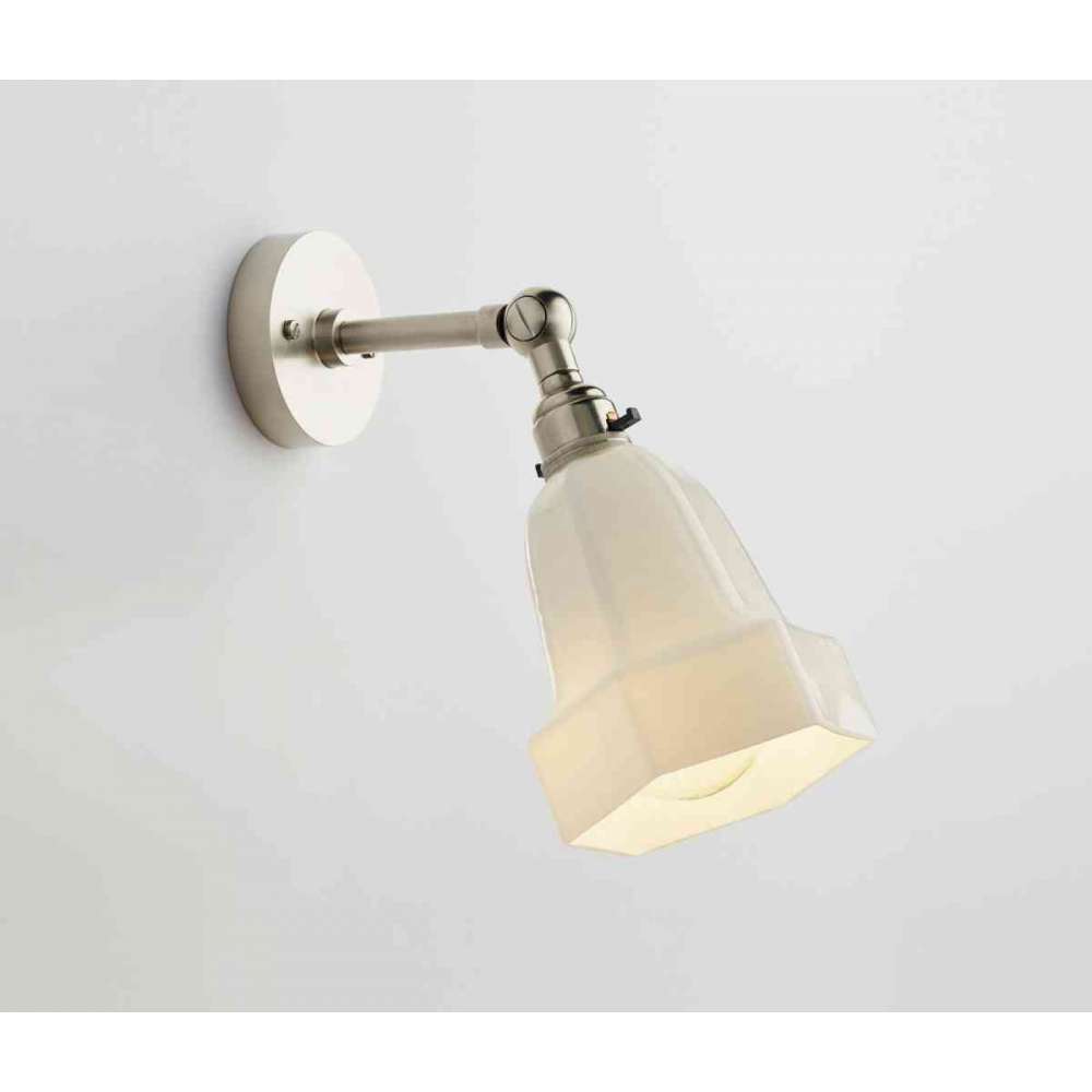 Mosiężna lampa ścienna z regulowanym ramieniem, oprawką B22 z wyłącznikiem bezpieczeństwa i sześciokątnym mlecznym szkłem.