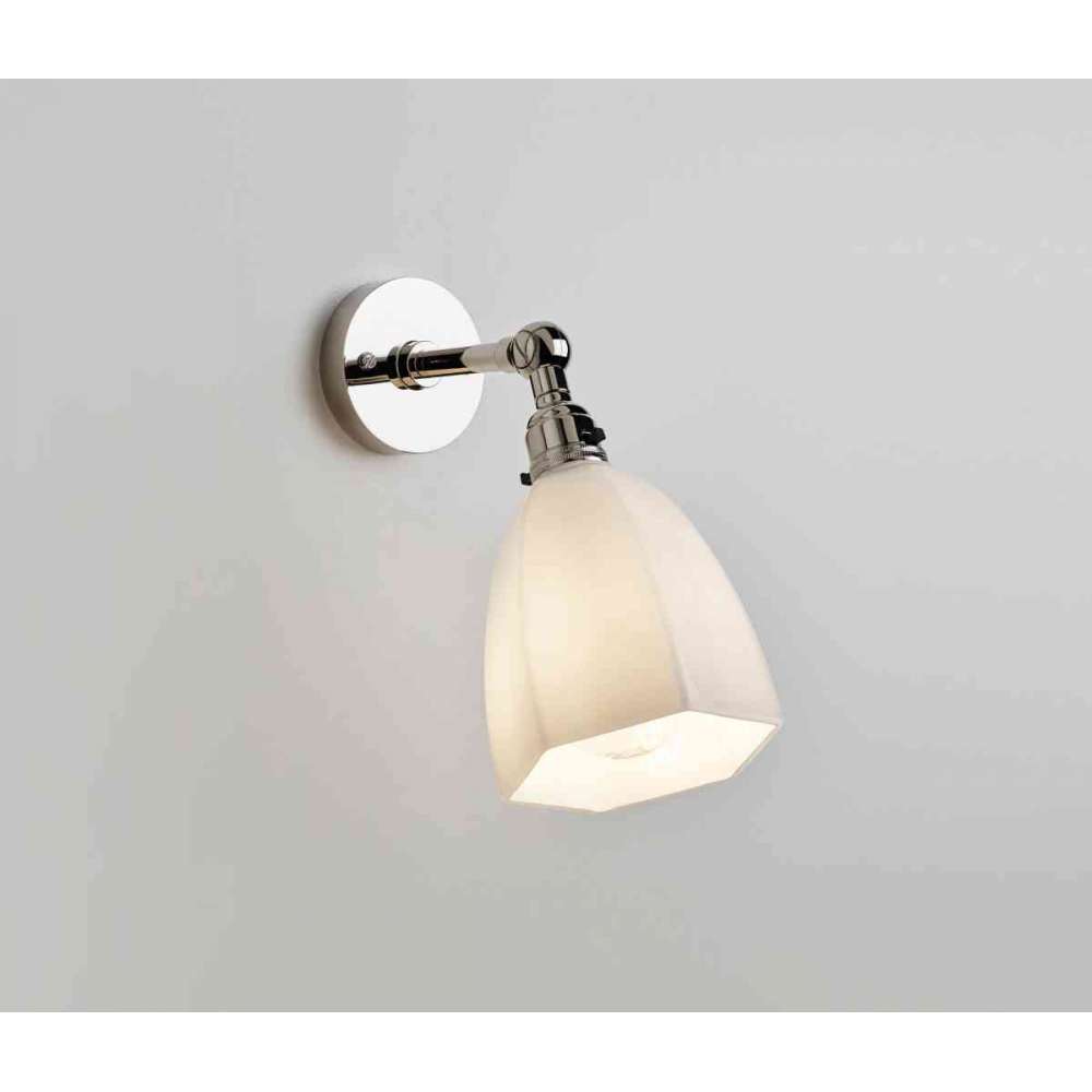Mosiężna lampa ścienna z regulowanym ramieniem, oprawką B22 z wyłącznikiem bezpieczeństwa i ozdobnym mlecznym szkłem.
