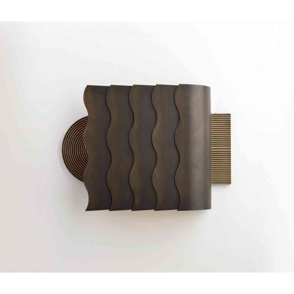 Kinkiet w stylu art-deco z masywną mosiężną płytką z falistym reliefem na masywnej płycie tylnej, ryflowanej i liniowanej