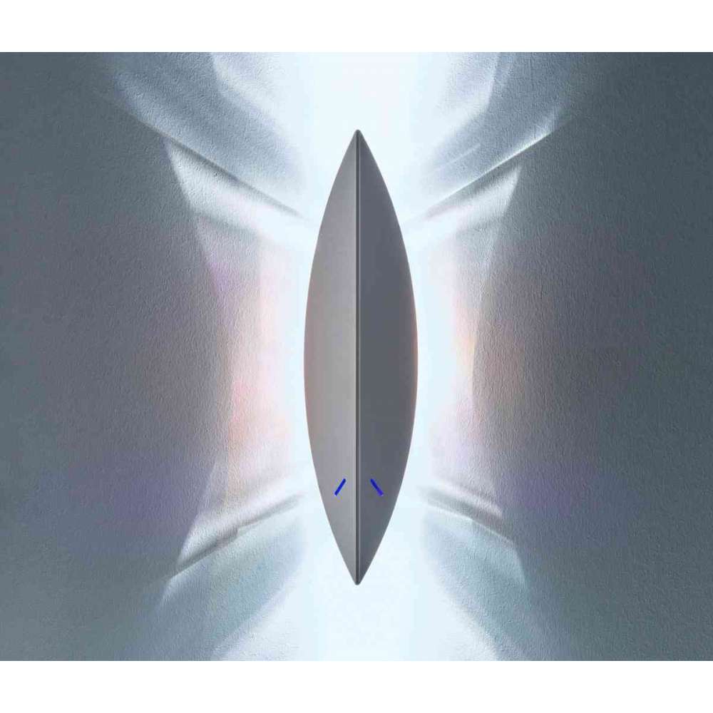 Oprawa ścienna składa się z polerowanego klosza ze stali nierdzewnej, przywołującego kształt tarczy Masajów. System soczewek rozprowadza światło. Klosz wyposażony jest w dwie aplikacje z przyciemnianego szkła, do wyboru w kolorze czerwonym lub niebieskim. Pokazane efekty świetlne zależą od jasności, barwy światła otoczenia oraz powierzchni lub materiału ściany.