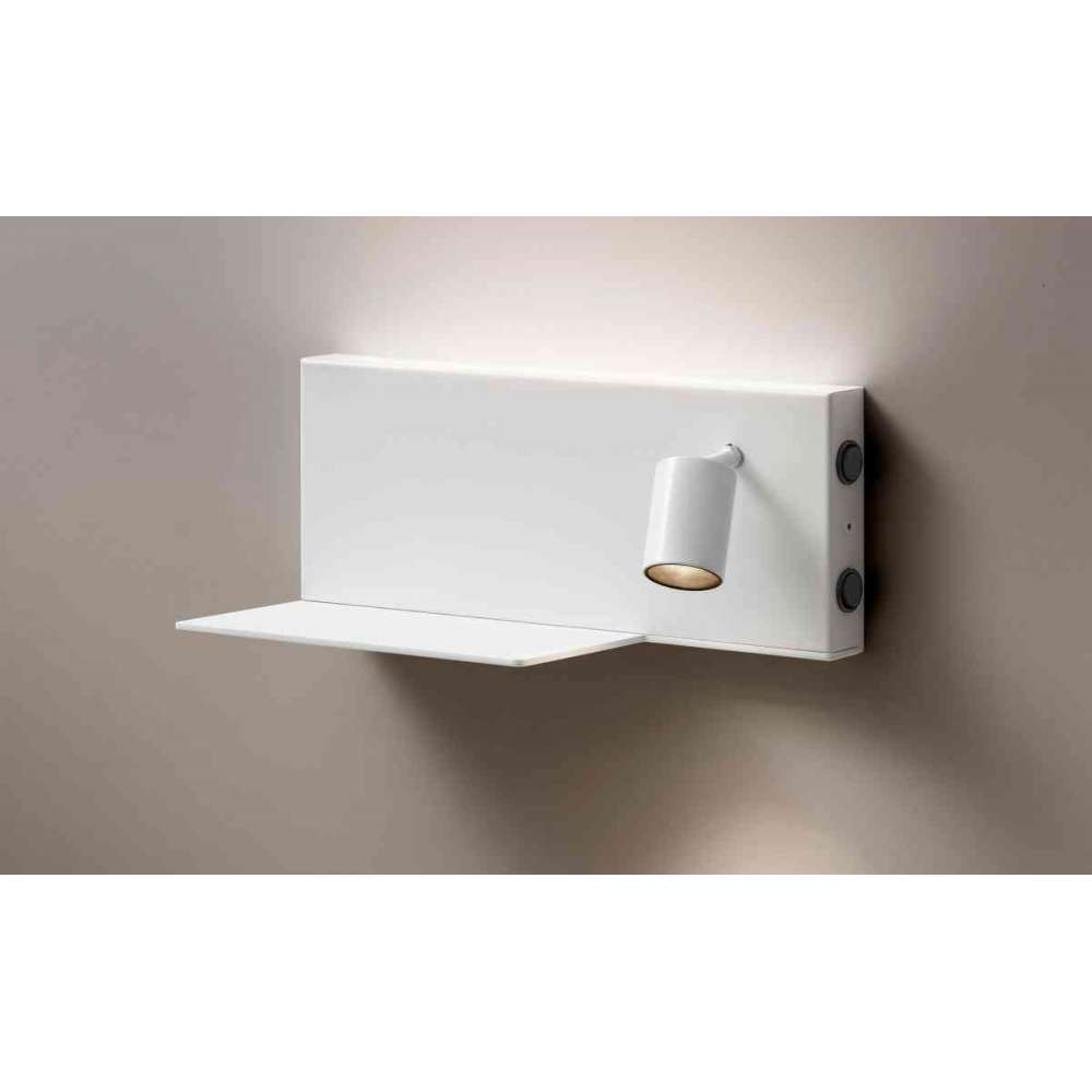 Oprawa ścienna do sypialni z pośrednim rozproszonym światłem i regulowaną lampką do czytania, w kolorze ciepłej bieli. Dostępna w dwóch wersjach lustrzanych do postawienia po lewej i prawej stronie łóżka, prezentuje półkę z gniazdem USB do ładowania baterii urządzeń elektronicznych, takich jak smartfony. Dostarczany ze zintegrowanymi sterownikami ON-OFF, ma podwójny przełącznik do oddzielnego sterowania lampką sufitową i lampką do czytania. Dostępne w wykończeniach biały, czarny, brąz, mosiądz matowy, tytan.