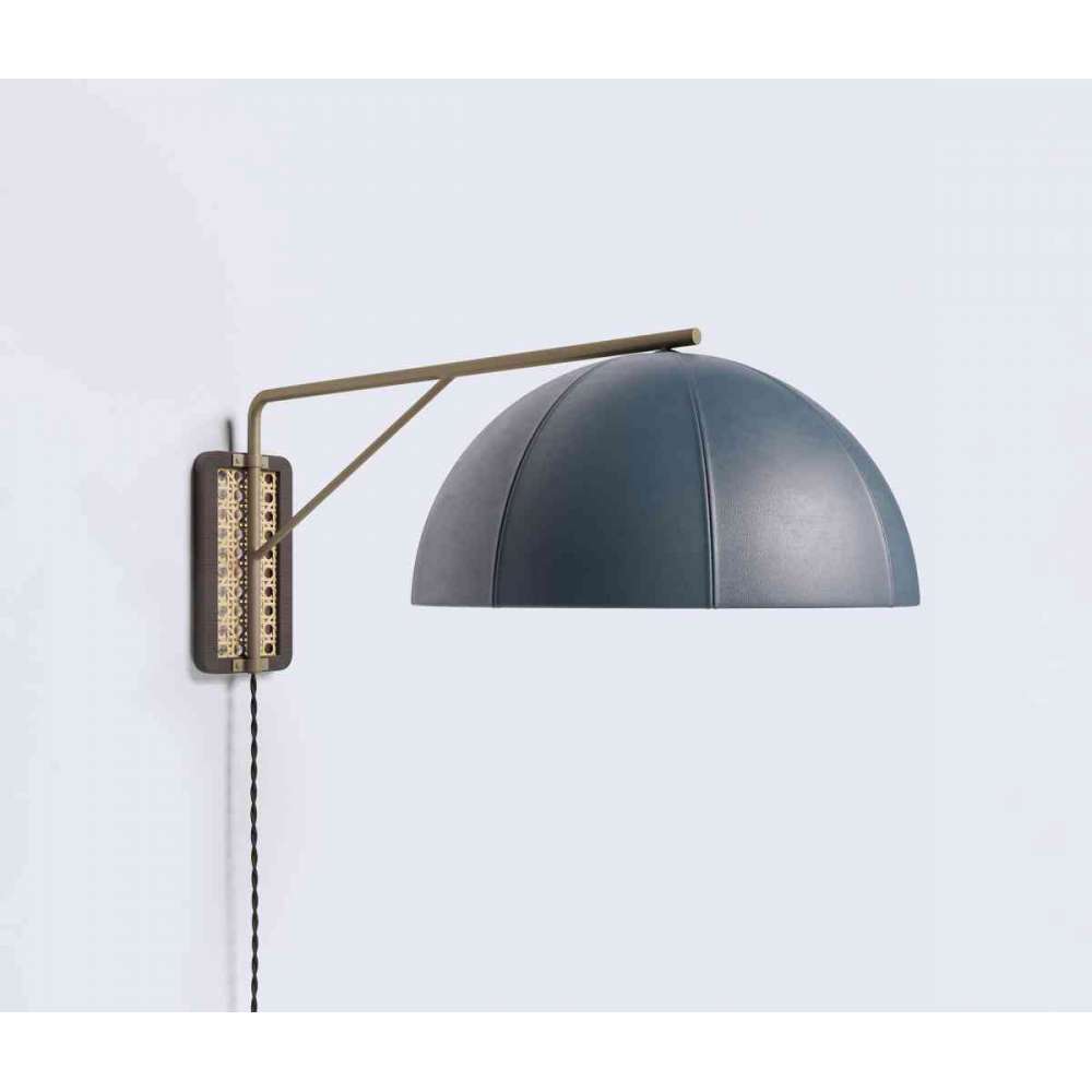 Wykonane ręcznie w Anglii , lampa ma solidną płytkę ścienną z jesionu z wbudowanym panelem o naturalnym splocie trzcinowym i ramię wspornikowe z satynowego mosiądzu, które można obracać o 180 stopni. Charakterystyczny klosz w kształcie kopuły pokryty jest rozciągniętą skórą z żarówką LED Tala w stylu filamentu. Tkany power flex z wbudowanym przełącznikiem dopełnia projekt