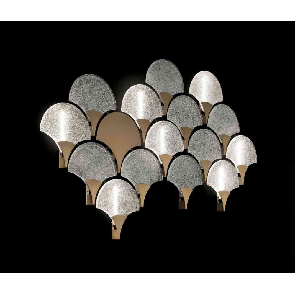 Dzięki nowoczesnej formie, która stała się bardziej tradycyjna dzięki technice Rugiada, opatentowanej w XX wieku przez Barovier&Toso, Tuileries jest nieskończonym kinkietem: jego doskonała symetria umożliwia tworzenie niekończących się kompozycji oświetlonych i nieoświetlonych elementów, zawsze doskonale ułożonych i wzbogaconych przez szczotkowana metaliczna struktura z ciepłym miodowo-brązowym kolorem. Zaproponowano pięć modeli, pomyślanych jedynie jako przykłady: możliwości personalizacji są nieograniczone, pozwalając na pokrycie całych ścian, prawie jak rodzaj luksusowej boazerii. Oświetlenie to LED 12V.