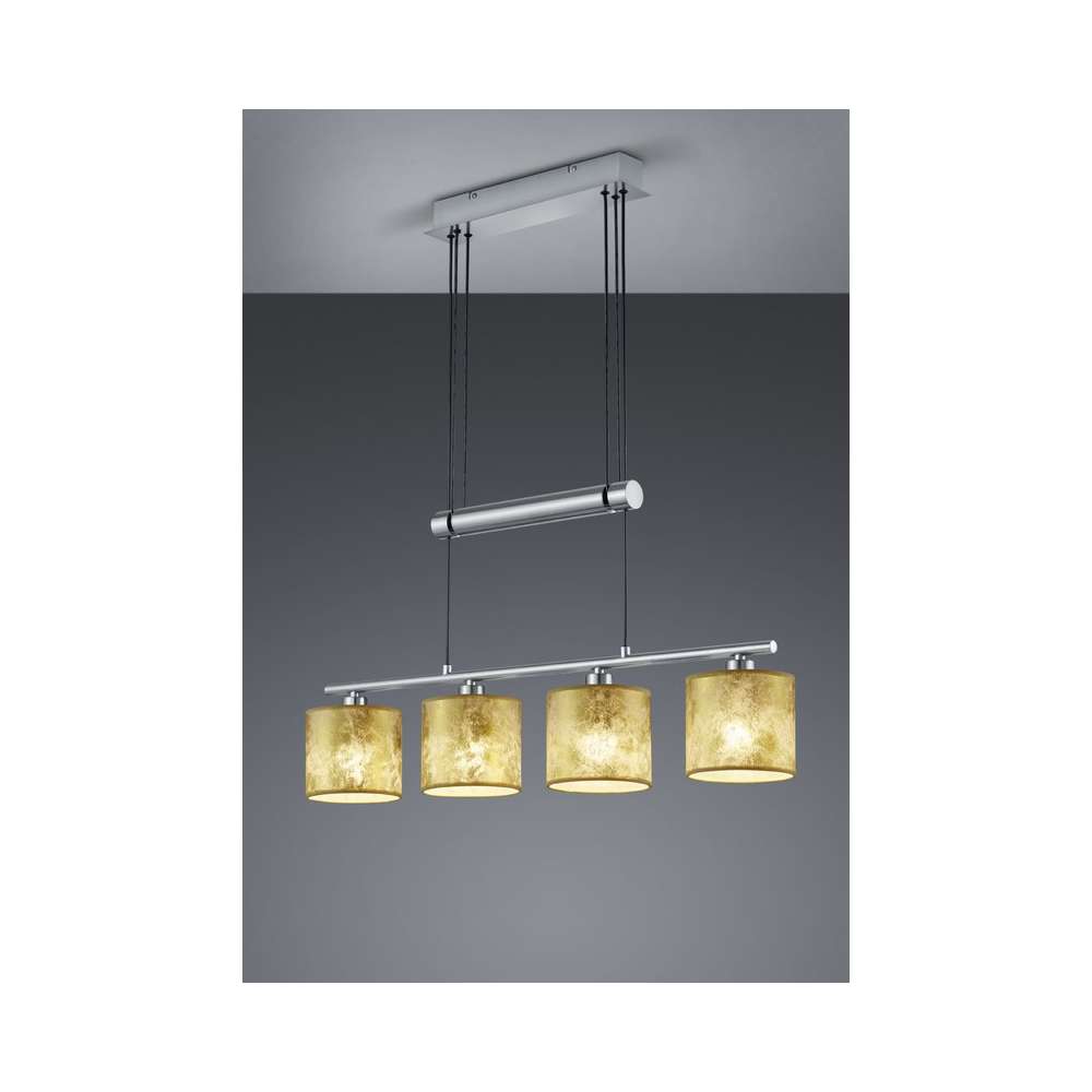 Źródło światła w zestawie nie Wysokość klosza / abażura 12 cm Wysokość 150 cm Średnica klosza / abażura 13,5 cm Szerokość 77 cm Rodzaj lampy Lampa wisząca Rodzaj gwintu E14 Regulacja mocy światła tak Producent Trio Moc (Wat) 28 W Kolor Złoty Kolor Srebrny IP (stopień szczelności) IP20 Ilość źródeł światła 4 Głębokość 13,5 cm