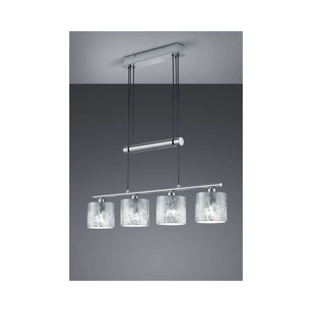 Źródło światła w zestawie nie Wysokość klosza / abażura 12 cm Wysokość 150 cm Średnica klosza / abażura 13,5 cm Szerokość 77 cm Rodzaj lampy Lampa wisząca Rodzaj gwintu E14 Regulacja mocy światła tak Producent Trio Moc (Wat) 28 W Kolor Srebrny IP (stopień szczelności) IP20 Ilość źródeł światła 4 Głębokość 13,5 cm