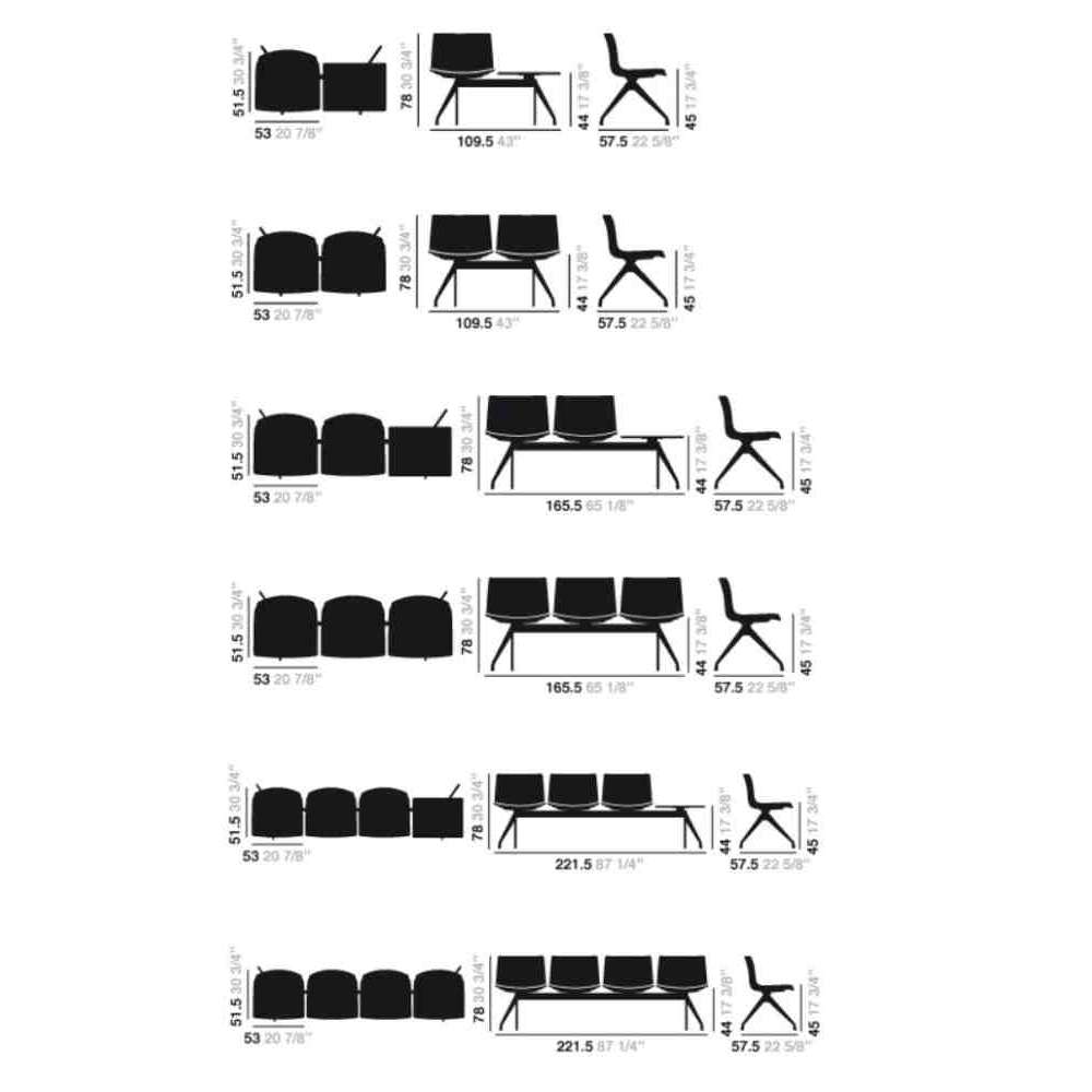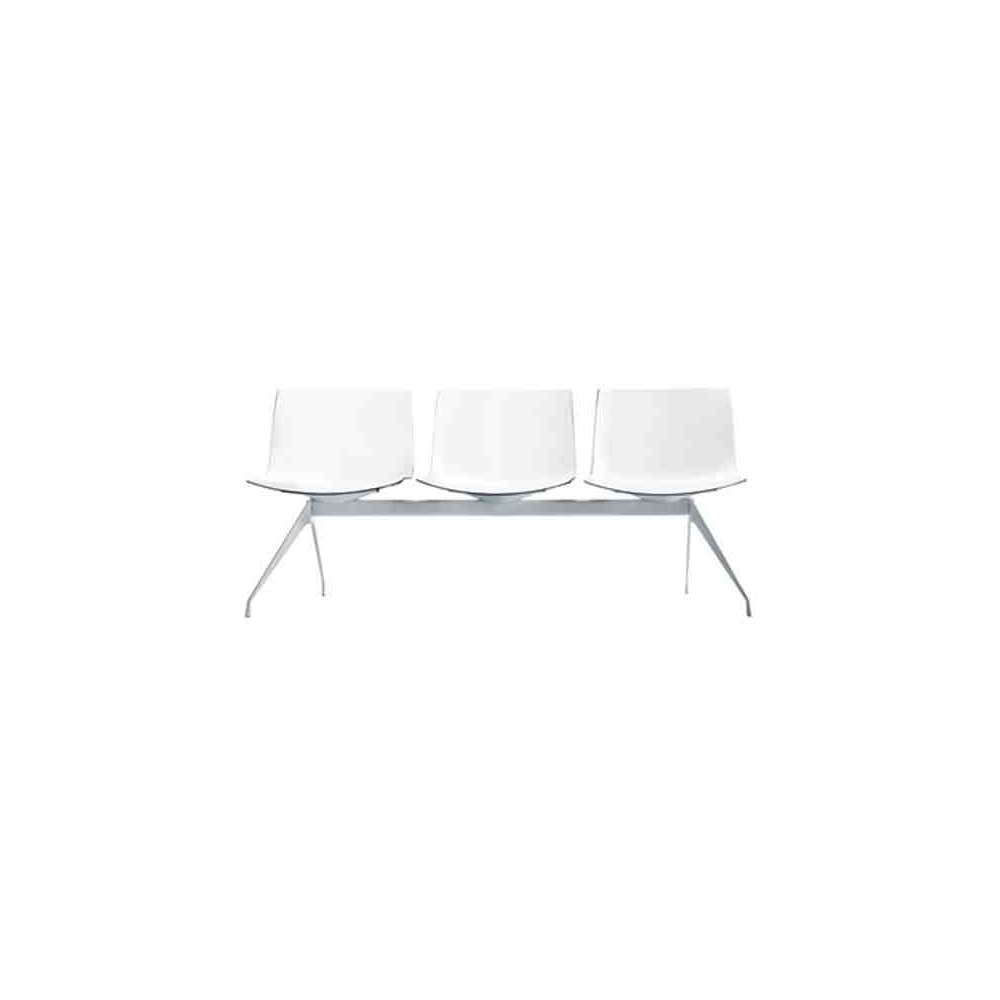 Dwu-, trzy- lub czteroosobowa ławka. Każde miejsce siedzące może być wyposażone w siedzisko lub blat stołu, oferując rozwiązania spełniające wszystkie wymagania. Metalowa rama malowana jest na biało, a korpusy są dostępne z polipropylenu, polipropylenu pokrytego twardą skórą lub tapicerowane tkaniną, skórą lub sztuczną skórą.