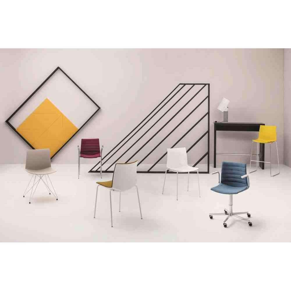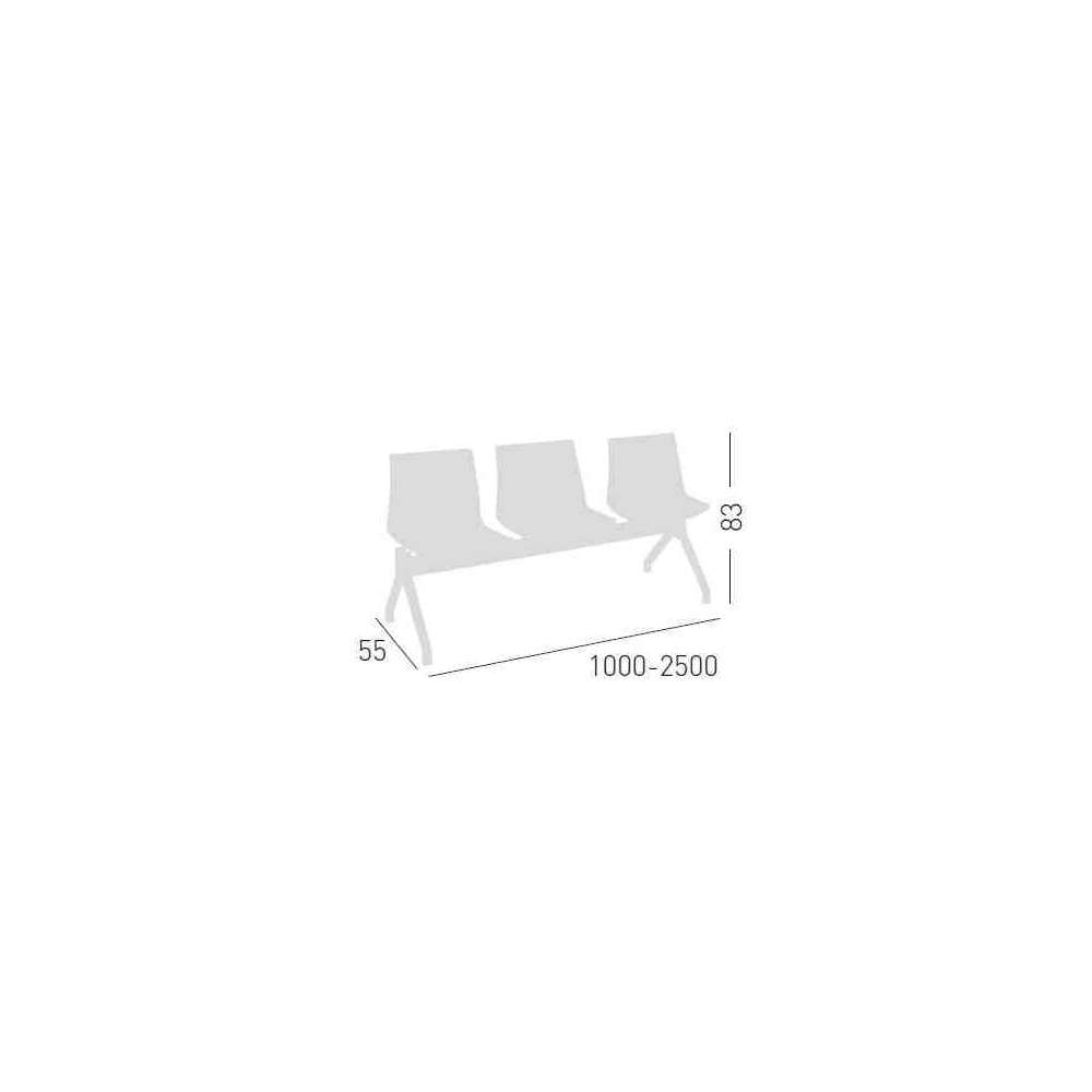 Tapicerowany kubełek z technopolimeru, ławka stelażowa z malowanego metalu i nogi z technopolimeru.