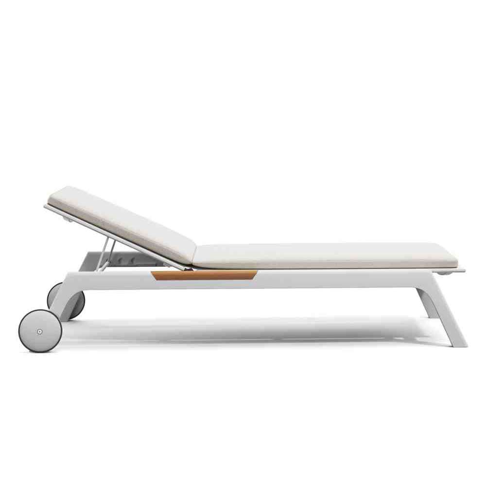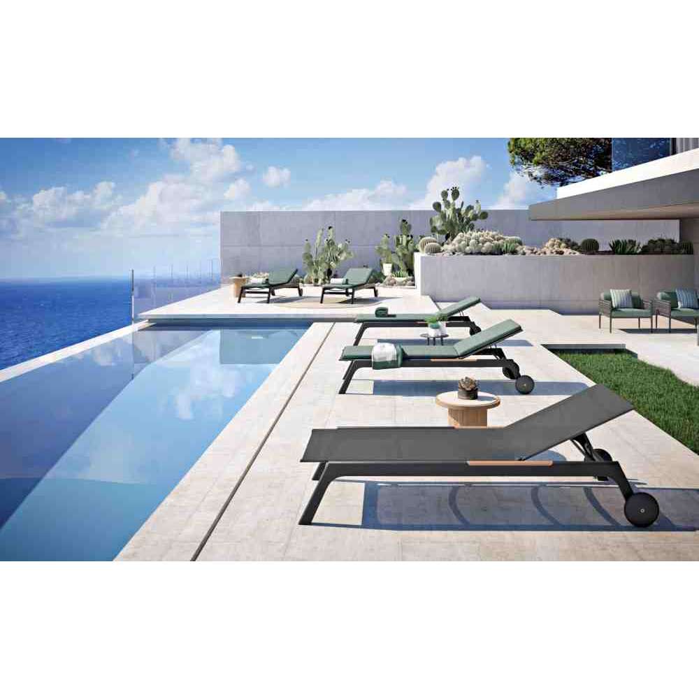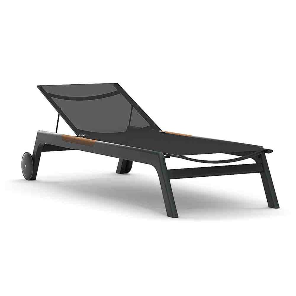 Czysty, czysty i ponadczasowy. Nevada leżak w kolorze grafitowym lub białym aluminium z wstawkami z drewna tekowego jest idealny do przestrzeni zewnętrznych i można go dostosować do każdego kontekstu, od mieszkalnego po hotelarski.