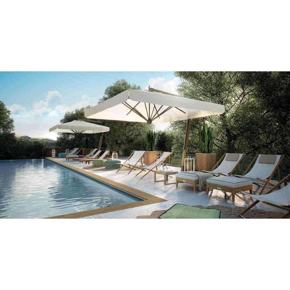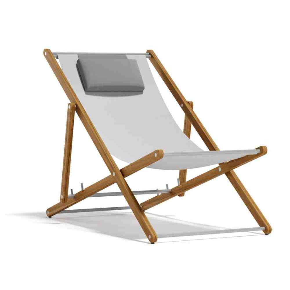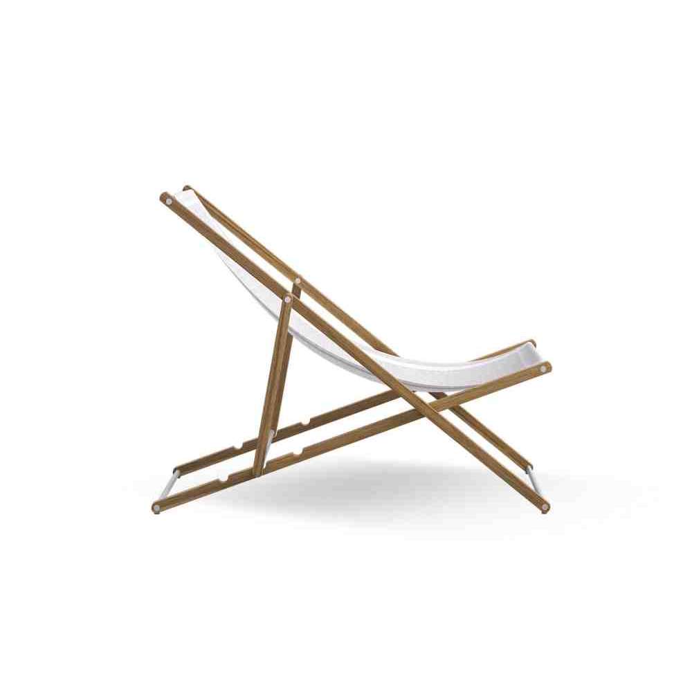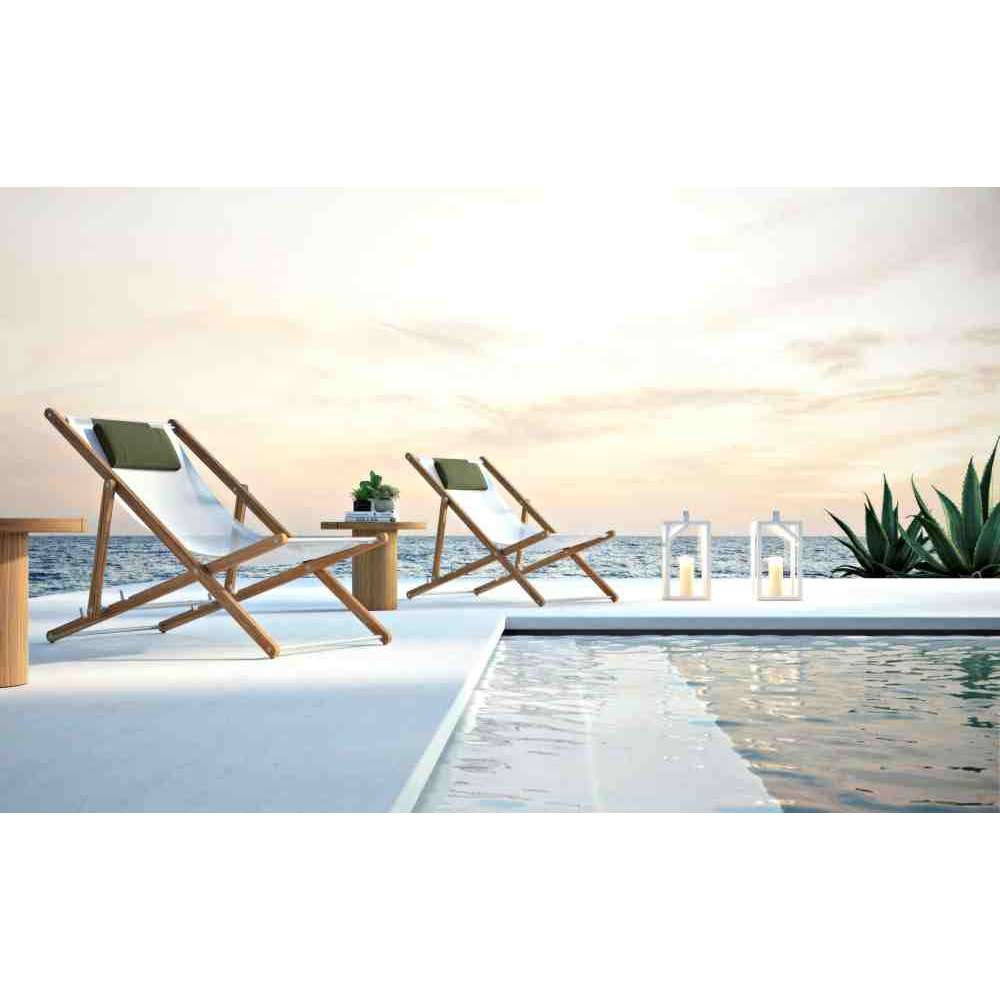 Ramki z litego drewna azjatyckiego TEAK, wykończone olejem; detale w wykończeniu ze szczotkowanej stali. Tkanina siedziska i zgrzewana mikrotermicznie tkanina na zewnątrz w kolorze białym.