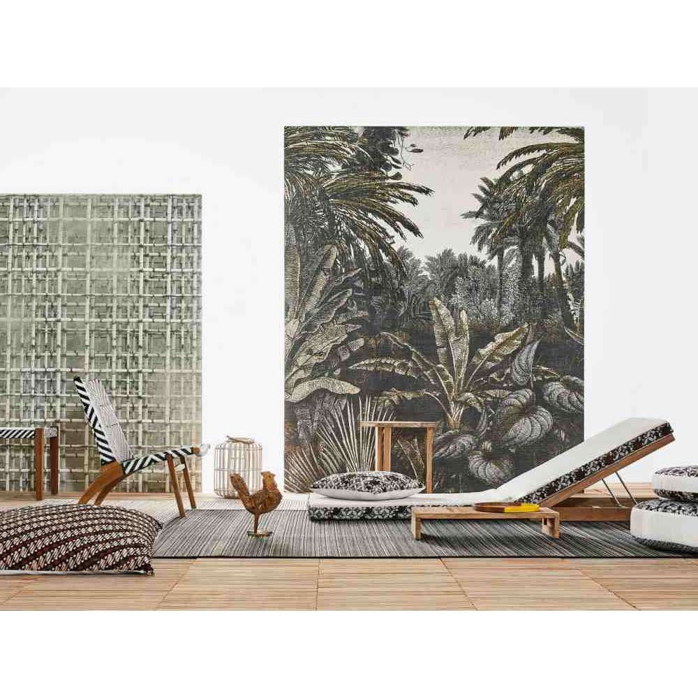 Stoły i krzesła wykonane są z drewna tekowego i tkanego syntetycznego rattanu w dwóch kolorach: dekorację stanowi w rzeczywistości naprzemienność czerni i bieli. Poduszki pufy posiadają dwa różne rodzaje obicia: styropian, który sprawia, że poduszka modeluje się do naszego kształtu podczas siedzenia, lub z pianki ekologicznej, ponieważ uzyskanej z lamówek pozostałych po obróbce pianki poliuretanowej: miękkiego i wygodnego materiału ekologicznego .