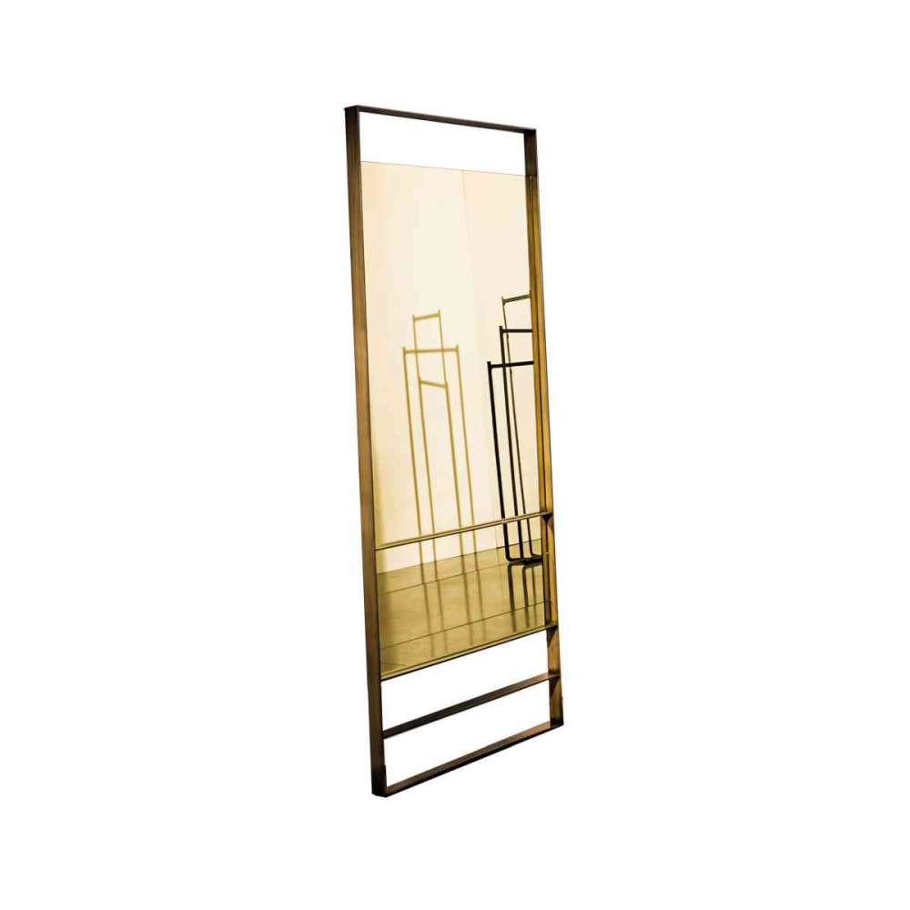 Prostokątne lustro podłogowe z lakierowaną aluminiową ramą, wykończeniem w kolorze mokka lub oksydowanym mosiądzem. Centralne lustro dostępne w różnych odcieniach.