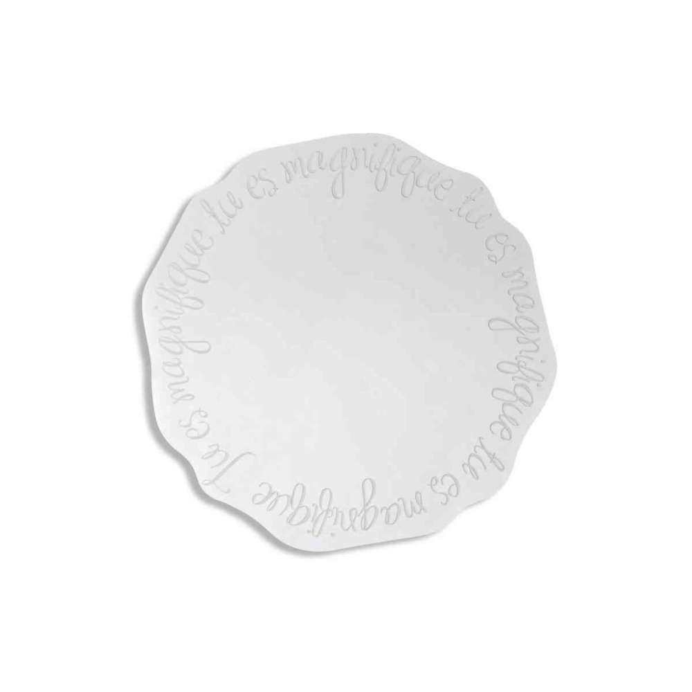 Okrągłe lusterko o grubości 4 mm, profilowane jednokolorowym sitodrukiem „Tu es magnifique”. Ř 101 cm