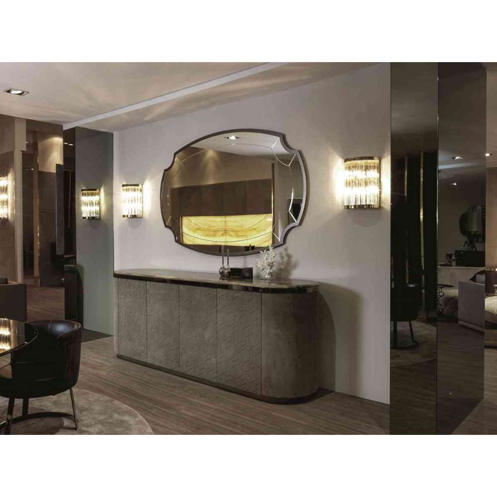 Neutralne, brązowe lub przydymione lustro z wytrawioną dekoracją, struktura ze szlifowanego metalu w wykończeniach: jasne jasne złoto, matowe szampańskie złoto, jasny chrom, jasny czarny chrom, matowy satynowy brąz.
