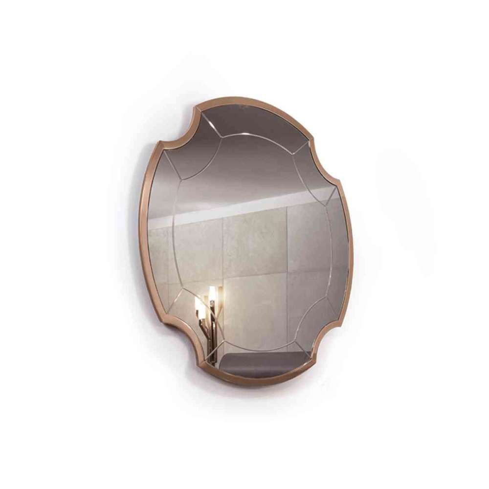Neutralne, brązowe lub przydymione lustro z wytrawioną dekoracją, struktura ze szlifowanego metalu w wykończeniach: jasne jasne złoto, matowe szampańskie złoto, jasny chrom, jasny czarny chrom, matowy satynowy brąz.