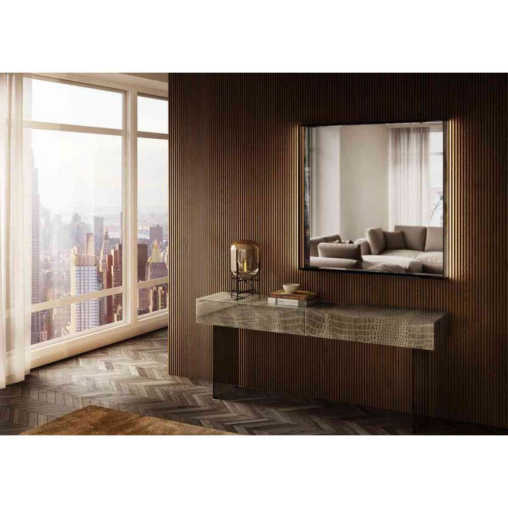 Przezroczysta szklana rama z krawędzią 45° i wbudowanym oświetleniem otaczają tę czysto odblaskową powierzchnię. Ten minimalistyczny design bawi się światłem i subtelnie oddaje harmonię wnętrz.