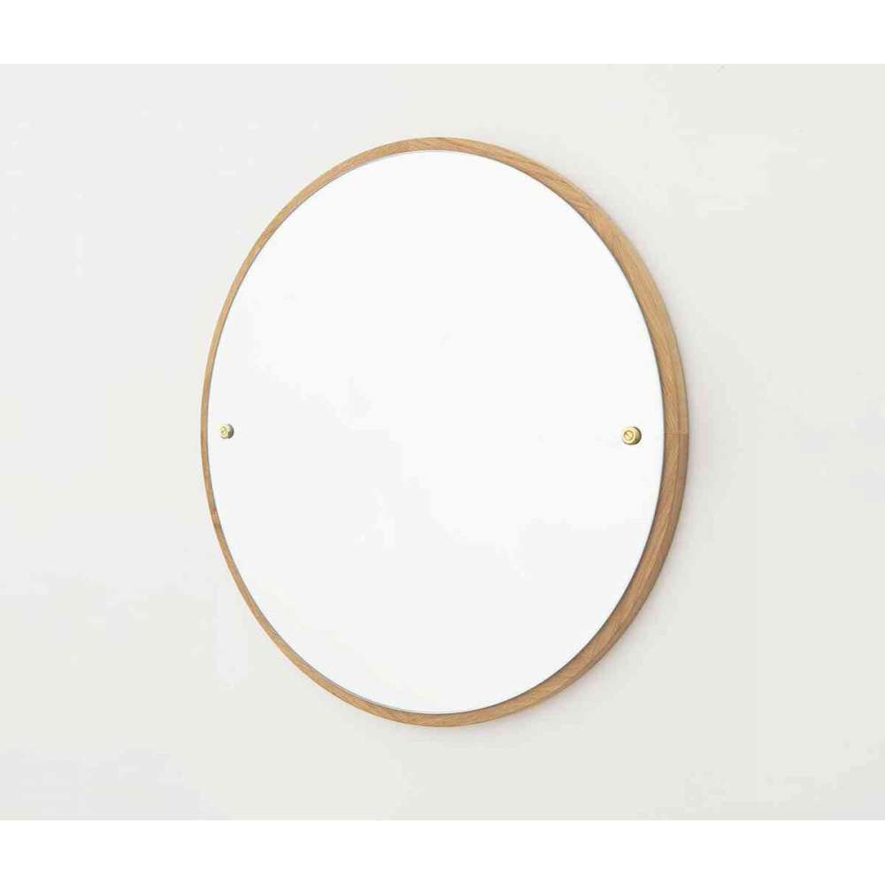 Klasyczne okrągłe lustro ze ściętymi krawędziami zamocowane do litego dębowego tyłu. Widoczne śruby nawiązują do analogowego podejścia do tego inspirowanego latami 50-tymi dzieła. Wizualna czystość okrągłego kształtu jest uhonorowana składem materiału.