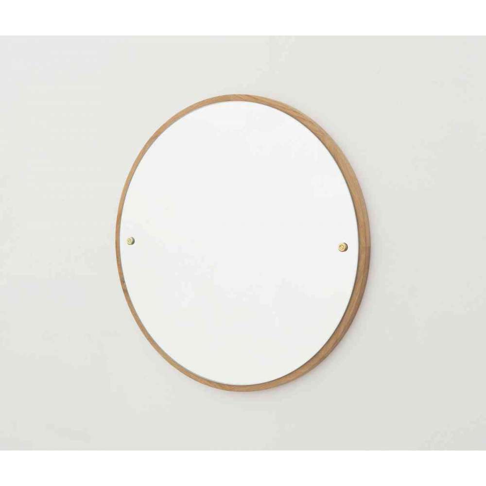 Klasyczne okrągłe lustro ze ściętymi krawędziami zamocowane do litego dębowego tyłu. Widoczne śruby nawiązują do analogowego podejścia do tego inspirowanego latami 50-tymi dzieła. Wizualna czystość okrągłego kształtu jest uhonorowana składem materiału.