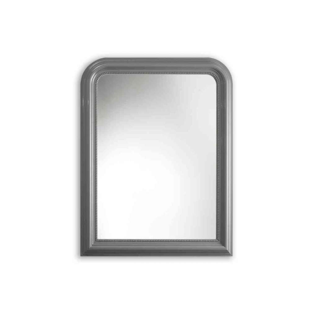 Bardzo eleganckie lustro charakteryzujące się zaokrąglonymi górnymi rogami. Szara lakierowana rama z drewna sosnowego jest ręcznie wykonana z wyrafinowaną dekoracją z reliefowego sznurka.