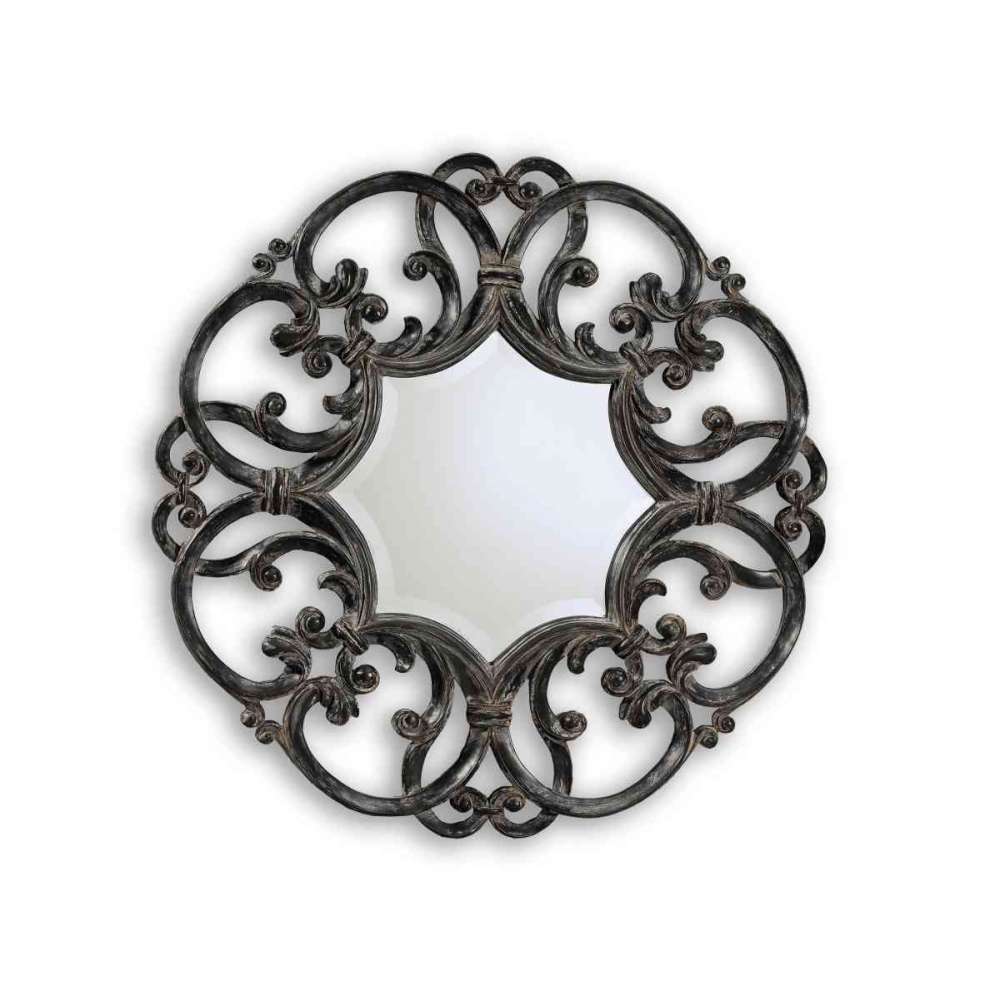 Cenne okrągłe lustro z ważną, ręcznie rzeźbioną sosnową ramą z kwiatowym wzorem. Dostępny również w wykończeniu złotym.