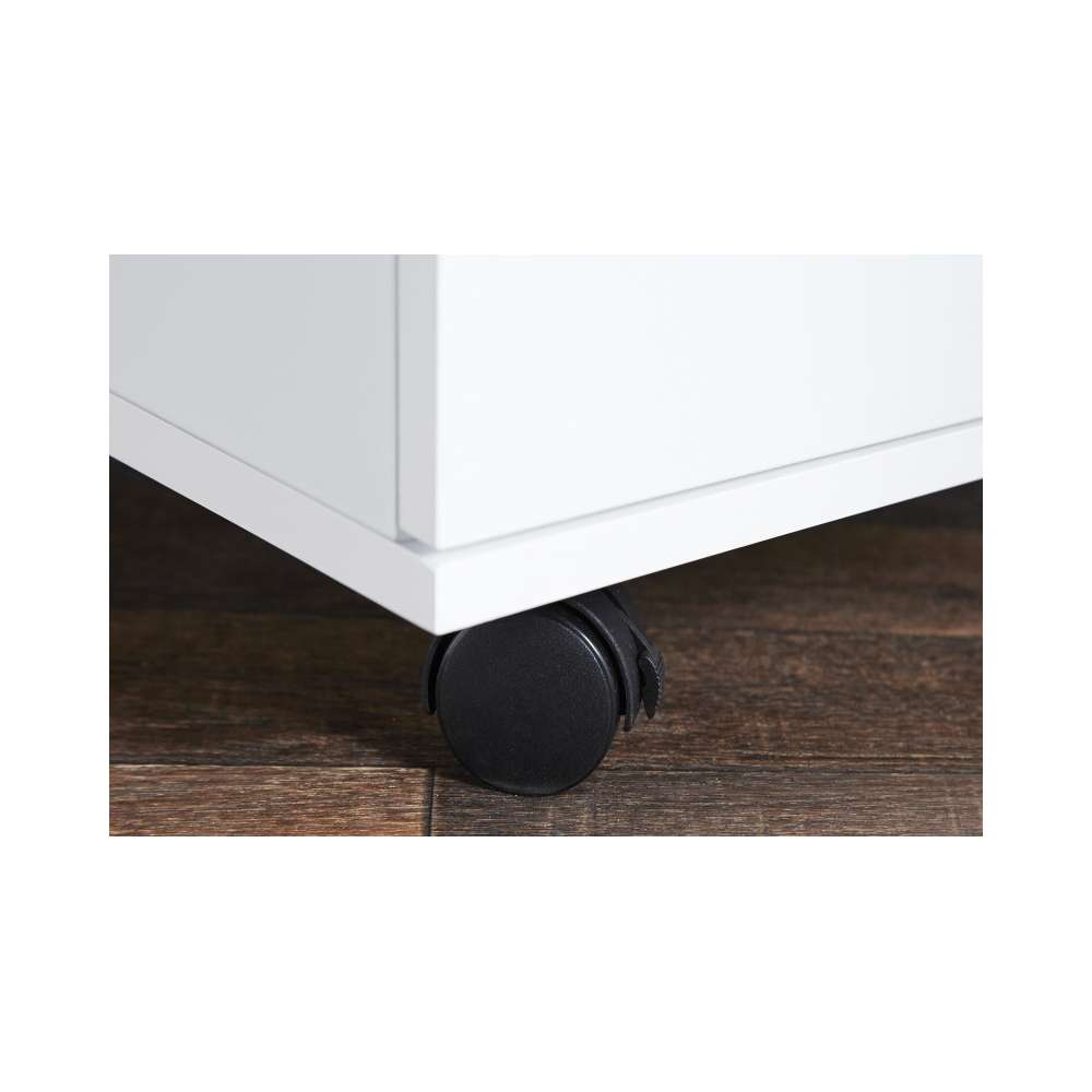 Szafa wykonana z płyty MDF lakierowany na wysoki połysk. Skośne fronty szuflad. Szafka na kółkach z blokadą. Maksymalna liczba elementów. Pojemnik: Sposób wysyłki 1: produkt do samodzielnego montażu Opakowanie: Tak