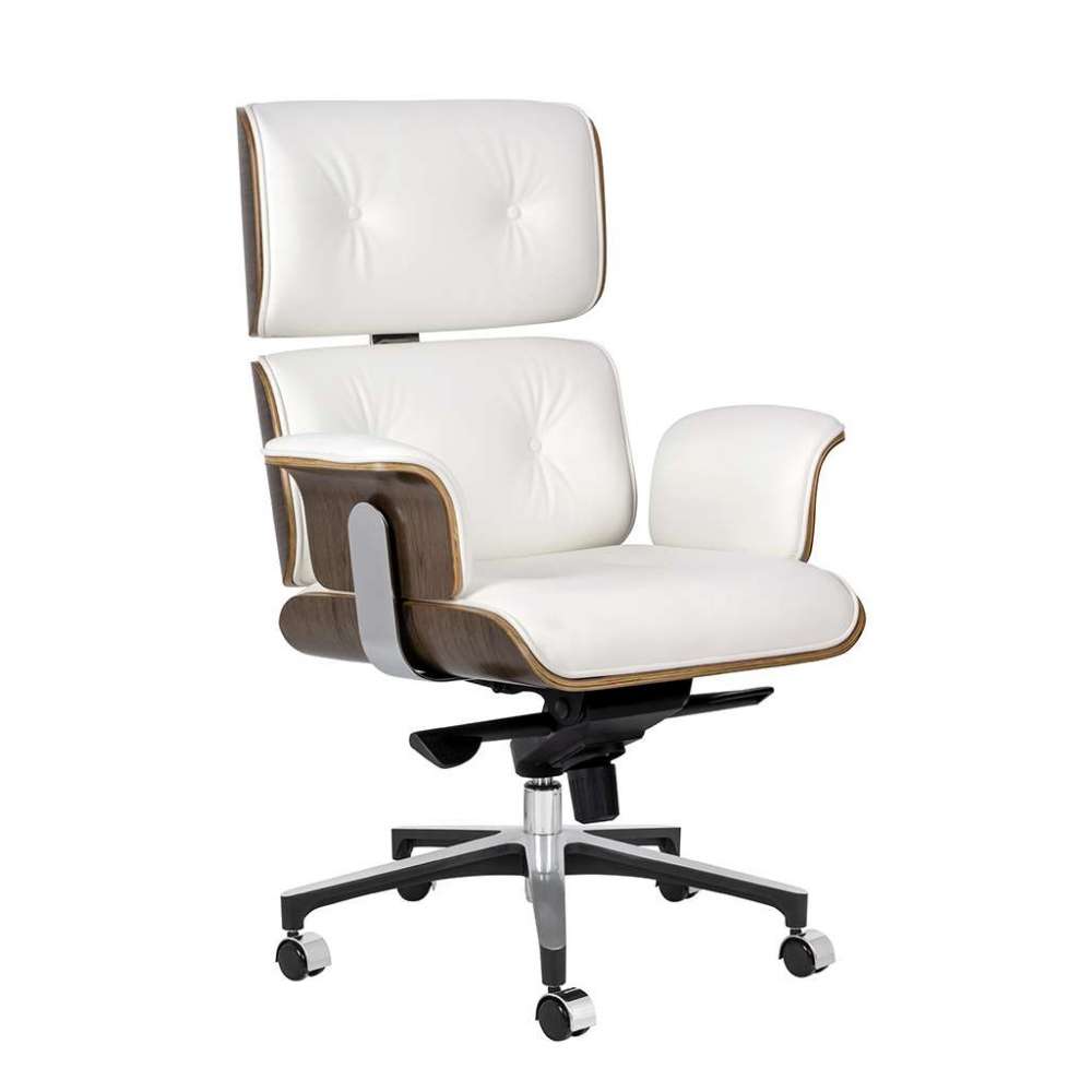Fotel biurowy Lounge Business biały - sklejka orzech | skóra naturalna | stal polerowana