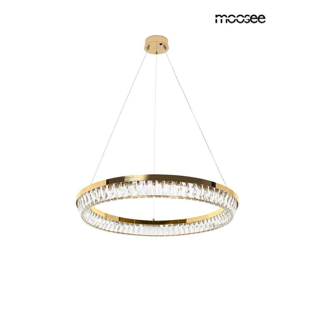 MOOSEE lampa wisząca SAVOY 80 złota. Kolekcja Savoy to elegancka i luksusowa seria oświetlenia, która zachwyca wyrafinowanym stylem i precyzyjnym wykonaniem. Charakteryzuje się połączeniem złotego metalu i przezroczystych kryształów, tworzących spektakularne efekty świetlne. W skład kolekcji wchodzą zarówno lampy wiszące, jak i sufitowe (plafony), dostępne w różnych rozmiarach, co pozwala na dopasowanie ich do każdego wnętrza. Dskonale sprawdzi się w stylowych salonach, luksusowych sypialniach oraz reprezentacyjnych przestrzeniach komercyjnych, takich jak hotele i restauracje. Dzięki spójnej estetyce, elementy kolekcji można dowolnie łączyć, tworząc harmonijną i imponującą aranżację w stylu Glamour. Światło: LED 42 W / 3360 lm / 3000 K Oprawa: śr. 80 cm / wys. 190 cm / gł. 80cm Klosz: śr. 80 cm / wys. 9 cm Mocowanie: śr. 12 cm / wys. 4,5 cm Długość linki: 180 cm Montaż: instalacja sufitowa Waga netto: 11,2 kg Wymiary opakowania: 85 cm / 85 cm / 15 cm.
