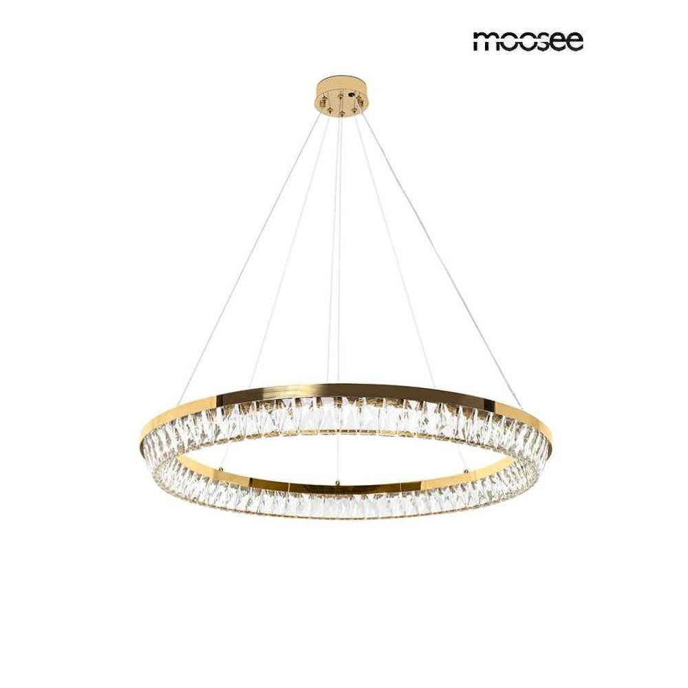 MOOSEE lampa wisząca SAVOY 100 złota. Kolekcja Savoy to elegancka i luksusowa seria oświetlenia, która zachwyca wyrafinowanym stylem i precyzyjnym wykonaniem. Charakteryzuje się połączeniem złotego metalu i przezroczystych kryształów, tworzących spektakularne efekty świetlne. W skład kolekcji wchodzą zarówno lampy wiszące, jak i sufitowe (plafony), dostępne w różnych rozmiarach, co pozwala na dopasowanie ich do każdego wnętrza. Dskonale sprawdzi się w stylowych salonach, luksusowych sypialniach oraz reprezentacyjnych przestrzeniach komercyjnych, takich jak hotele i restauracje. Dzięki spójnej estetyce, elementy kolekcji można dowolnie łączyć, tworząc harmonijną i imponującą aranżację w stylu Glamour. Światło: LED 72 W / 5720 lm / 3000 K Oprawa: śr. 100 cm / wys. 190 cm / gł. 100cm Klosz: śr. 100 cm / wys. 9 cm Mocowanie: śr. 15 cm / wys. 5 cm Długość linki: 180 cm Montaż: instalacja sufitowa Waga netto: 16,8 kg Wymiary opakowania: 105 cm / 105 cm / 15 cm.