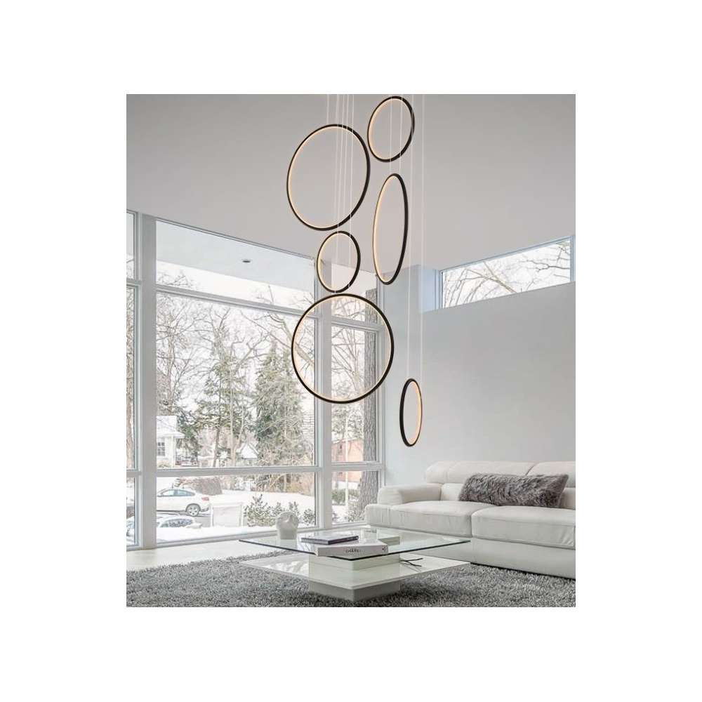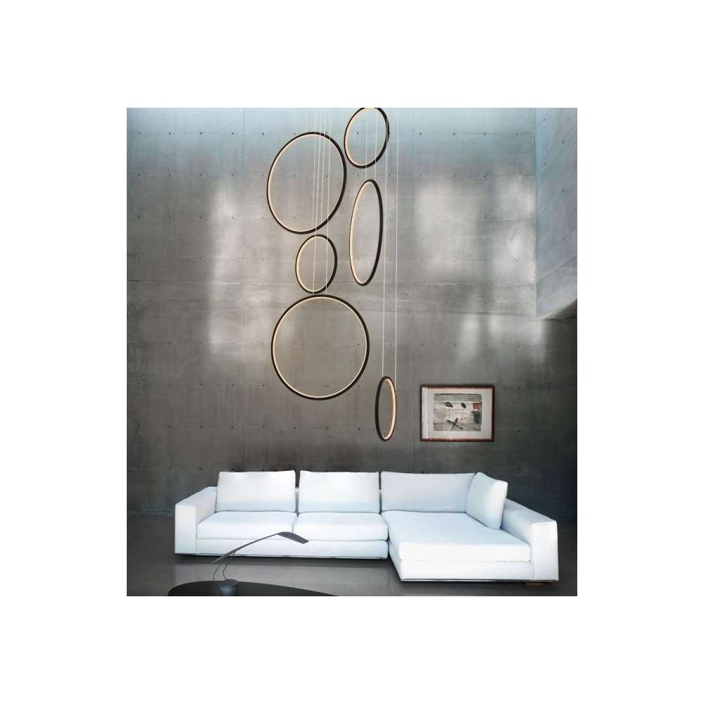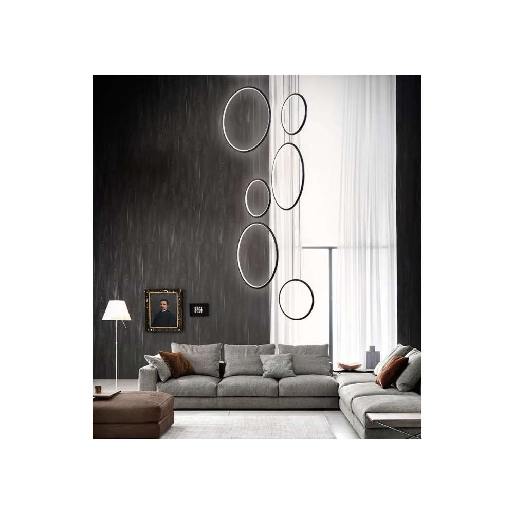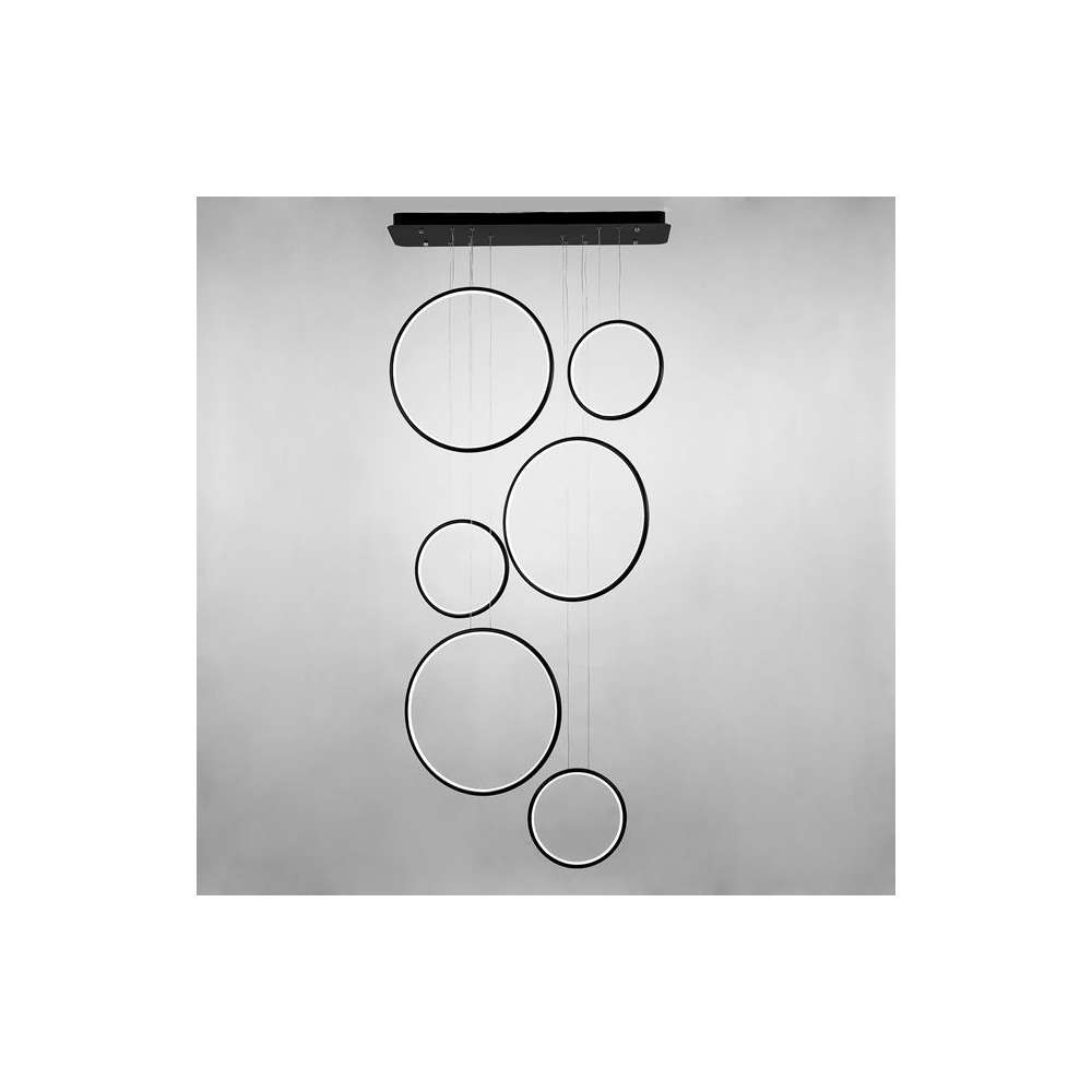 Nowoczesne projektant i zawieszane LEDVISION H w pierścieniu sześciu emitującej światło o dużej mocy 130W światło czarny kolor światła LED i gorącej 3000K. Lampa szczególnie zalecany do nowoczesnych wnętrz, biur, jak i holu.