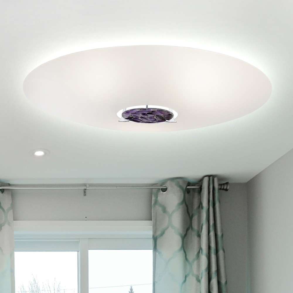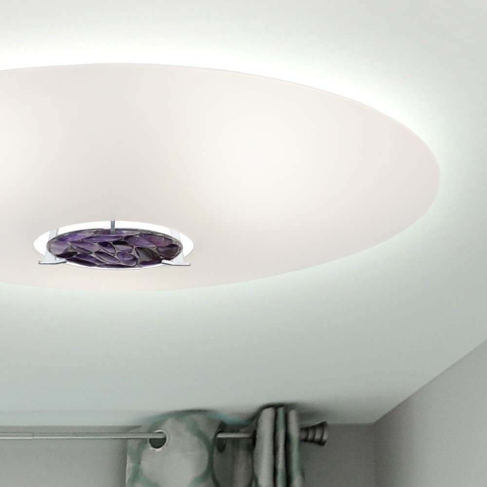 Lampa AURA to połączenie pięknego, giętego szkła, hartowanego i piaskowanego z kamieniami półszlachetnymi (na zamówienie): ametyst, kryształ górski, karneol, cytryn, kwarc różowy. Dostępna również wersja ze szklanym środkiem w średnicach 60 i 80 cm.
