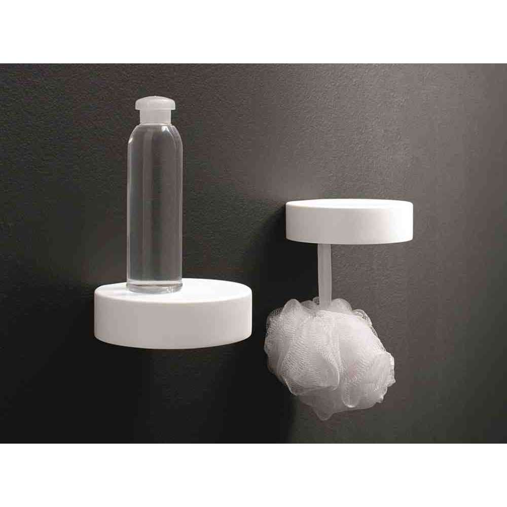 Tecnoblu jest tak uniwersalnym materiałem, że staje się również częścią półek do wstawiania w strefach prysznicowych: okrągły, o znacznej grubości, z praktycznym ukrytym haczykiem, przydatnym do wieszania akcesoriów codziennego użytku.