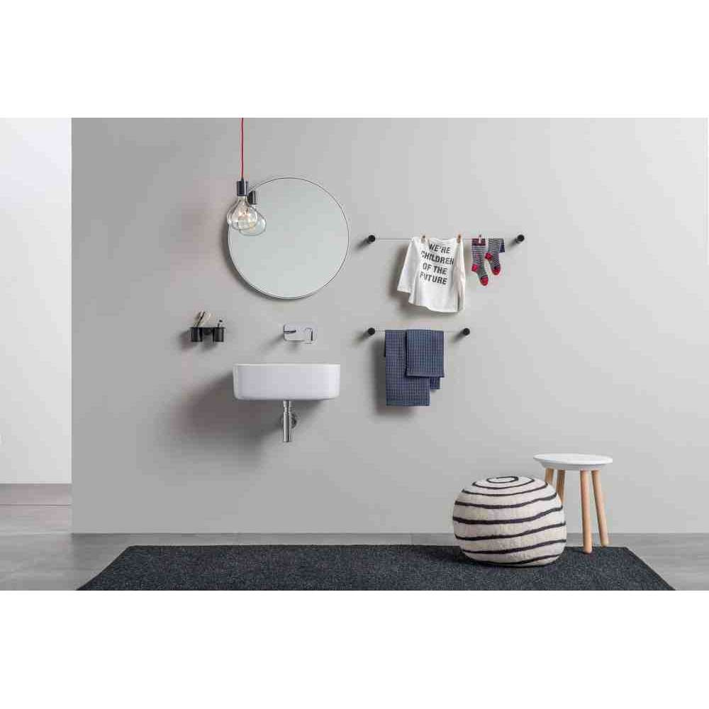 Kabel pełni rolę wieszaka na ręcznik do umywalki i bidetu, ale jest też przydatnym wspornikiem, na którym można powiesić różne akcesoria, takie jak suszarka do włosów czy szczotka. Na cylindrycznych korpusach można znaleźć małą powierzchnię podparcia na mydło i butelki oraz element zabezpieczający o wadze do 120 kg: cechy, które podkreślają filozofię i misję promowaną przez Ever Life Design.