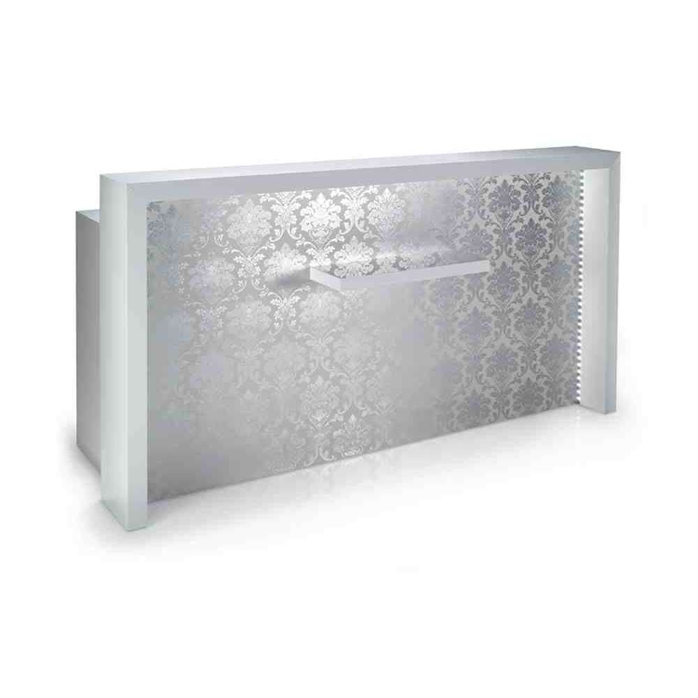 Recepcja z dekorowanym frontem podświetlanym LED. Szafka z laminatu z półką na klawiaturę, dwojgiem drzwi i dwiema szufladami z kluczami. Wyprodukowane we Włoszech.