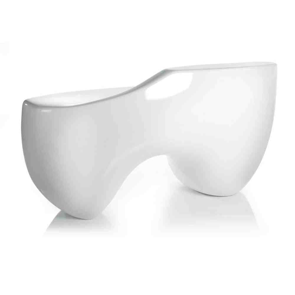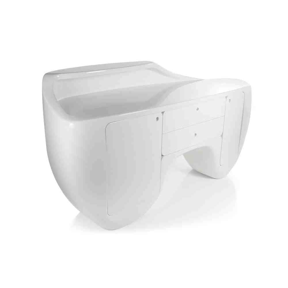 Recepcja z włókna szklanego z dwiema szufladami i dwojgiem drzwi po bokach.