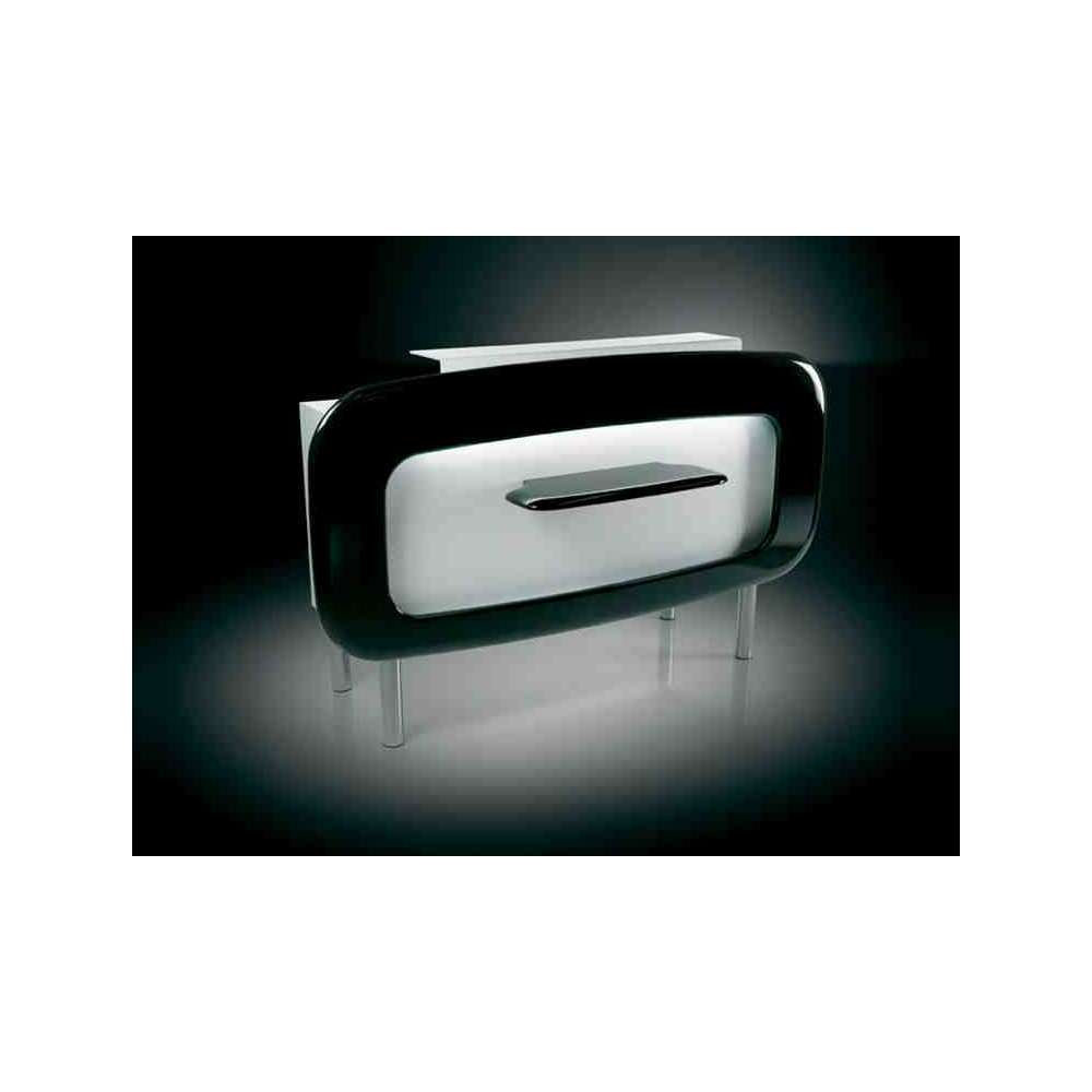 Pulpit kasowy z panelem przednim z profilowanej i lakierowanej wstępnie wykończonej melaminy. Konstrukcja z półkami, drzwiczkami i szufladą z kluczem. Stopki z polerowanego aluminium. Dostępne z cm.130 lub cm. 170 szerokości. Wyprodukowane we Włoszech.