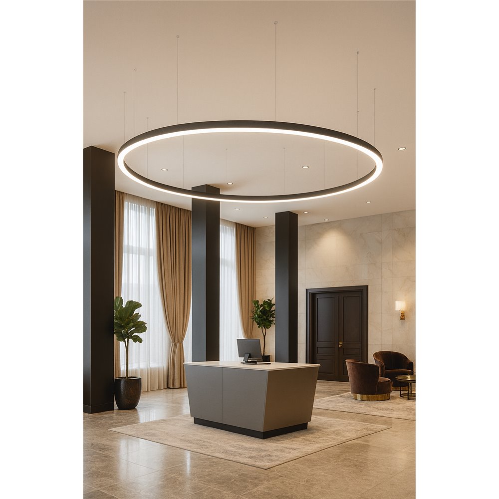 Zastosowania publiczneHotele: W holach, korytarzach oraz pokojach hotelowych zapewniają eleganckie oświetlenie, będąc zarówno źródłem ogólnym, jak i punktowym nad łóżkiem czy biurkiem, co podkreśla nowoczesny design i zapewnia komfortowy pobyt gościom. Restauracje: Nad stołami lub barem tworzą przyjemną atmosferę, dodając elegancji i równomiernie oświetlając przestrzeń, co podkreśla estetykę wnętrza i tworzy dogodne warunki dla gości. Kawiarnie i bary: Oprócz funkcji oświetleniowych, pełnią również rolę dekoracyjną, podnosząc elegancję i nowoczesność wnętrza, a zawieszone nad stołami lub stanowiskami barowymi dodają przestrzeni charakteru. Sale konferencyjne i spotkaniowe: Zapewniają prestiżowe oświetlenie ogólne, dostarczając wystarczającej ilości światła do pracy, co sprzyja efektywnemu przebiegowi spotkań biznesowych. Sklepy i galerie sztuki: Wyeksponowują produkty lub dzieła sztuki, dzięki czemu dodają im atrakcyjności i podkreślają ich walory estetyczne, co przyciąga uwagę klientów czy zwiedzających. Lampy "Elipsa II" nie tylko spełniają funkcje oświetleniowe, ale także stanowią element aranżacyjny, który nadaje charakteru i elegancji różnym przestrzeniom. |