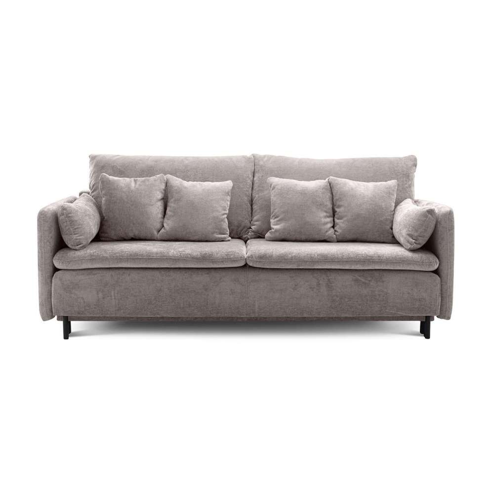 Sofa Miria to doskonały przykład nowoczesnego, minimalistycznego designu, który łączy elegancję z funkcjonalnością. Lekka forma, wąskie podłokietniki oraz poduchy dekoracyjne sprawiają, że idealnie wkomponuje się w każde wnętrze, dodając stylowego charakteru. Dzięki mechanizmowi rozkładania typu DL, sofa w łatwy i szybki sposób zamienia się w wygodne miejsce do spania, które zaspokoi potrzeby gości. Wbudowany pojemnik na pościel to praktyczne rozwiązanie, które umożliwia codzienne utrzymanie porządku. Wnętrze sofy wypełniają sprężyny faliste oraz wysokoelastyczna pianka, co zapewnia maksymalny komfort użytkowania. Wybór tkanin i kolorów pozwala na personalizację, co czyni każdy egzemplarz unikatowym. Dostępne tkaniny łatwoczyszczące. Miria to idealna propozycja dla osób ceniących nowoczesne rozwiązania oraz estetyczny design! Wymiary: wys. 94 cm / szer. 215 cm / gł. 96 cm Wysokość do krawędzi siedziska: 45 cm Powierzchnia spania: 200 x 140 cm Głębokość po rozłożeniu: 145 cm.